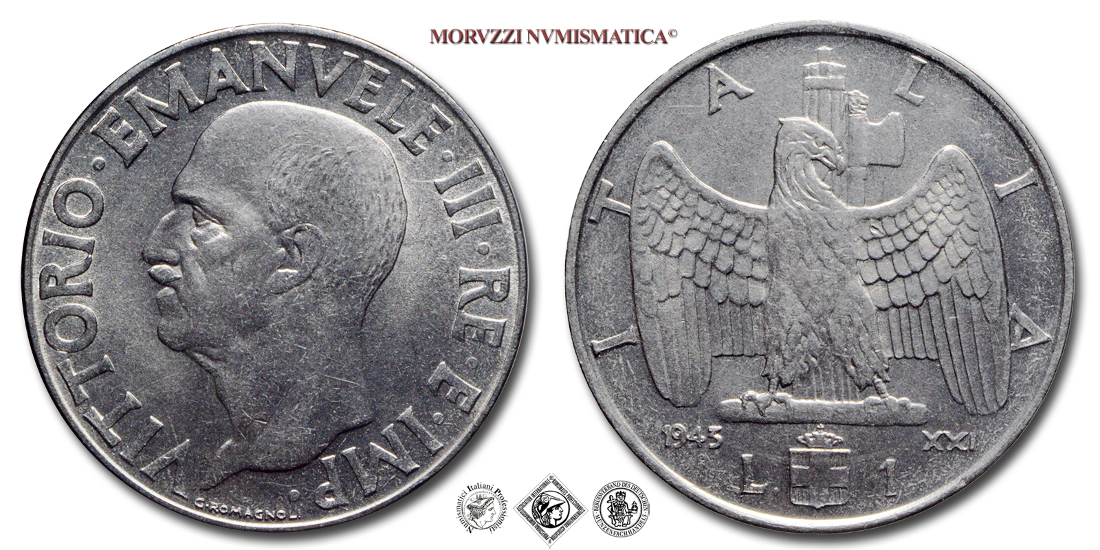 Regno d'Italia, VITTORIO EMANUELE III, 1900-1943, LIRA, Impero, Emissione: 1943 XXI, D/ VITTORIO • EMANUELE • III • RE • E • IMP •, testa nuda del Re a s.; in basso, lungo il bordo: G • ROMAGNOLI, R/ aquila con ali spiegate e fascio sullo sfondo, intorno: ITALIA; in basso: stemma sabaudo tra il valore (L • 1) con a d. la data dell'Era Fascista (XXI) e a s. il millesimo (1943) e il segno di zecca (R), Zecca di Roma, Rif. bibl. Pagani, 797; Metallo: AC, gr. 8,09, (MI130246), Diam.: mm. 26,58, qFDC, (R)