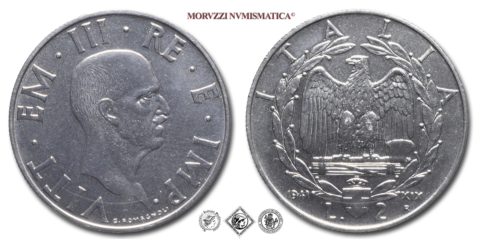 Regno d'Italia, VITTORIO EMANUELE III, 1900-1943, LIRE 2, Impero, Emissione: 1941 XIX, D/ VITTORIO • EMANUELE • III • RE • E • IMP •, testa nuda del Re a s.; in basso, lungo il bordo: G • ROMAGNOLI, R/ aquila con ali spiegate e fascio tra gli artigli; intorno: corona di alloro e la scritta ITALIA; in basso: stemma sabaudo tra il valore (L • 2) con a d. la data fascista (XIX) e il segno di zecca (R) e a s. il millesimo (1941), Zecca di Roma, Rif. bibl. Pagani, 760; Metallo: AC, gr. 9,88, (MI130838), Diam.: mm. 29,13, SPL, (NC)