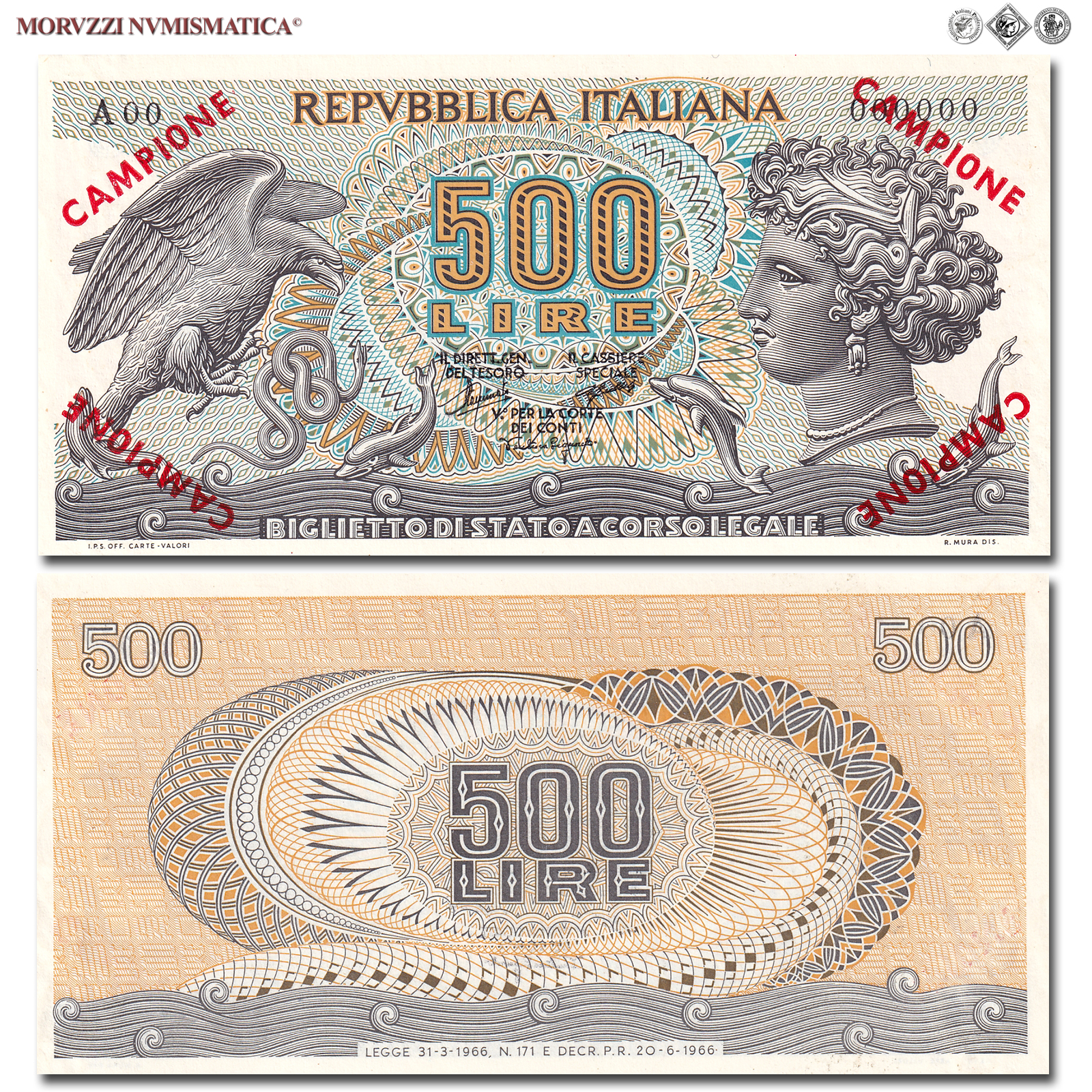 Italia, Repubblica, BIGLIETTO DI STATO, LIRE 500, Aretusa - campione, 20.06.1966, D/ nella destra ninfa Aretusa, nella sinistra aquila che ghermisce serpente e delfini uscenti dalle acque, R/ al centro "500 LIRE", in due righe, entro disegni geometrici, Rif. bibl. CfrCrapanzano, BS58; (CM11443), Firme: Stammati, Gubbels, Ventura Signoretti, di serie: A00 000000, FDS, (R)
