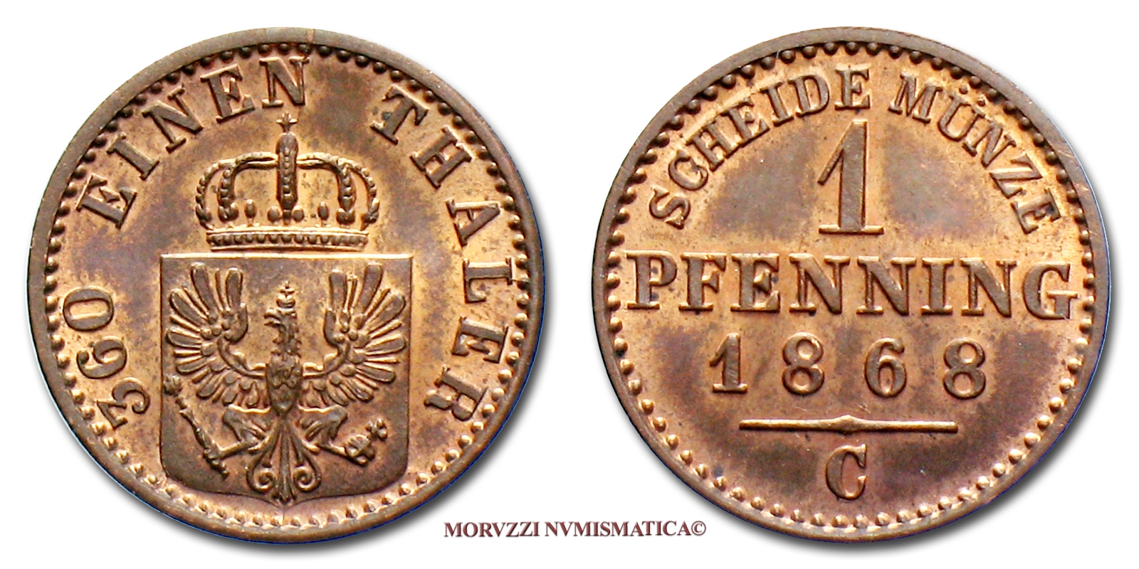 Stati tedeschi, Prussia, GUGLIELMO I, PFENNIG, 1868 C, zecca di Cleve, RAME, FDC, (Jaeger 50) / münzen von Wilhelm I. König von Preußen PFENNING Münzstätte Kleve Stgl. (World silver coins - monete mondiali - monete europee - monete tedesche - moneta)
