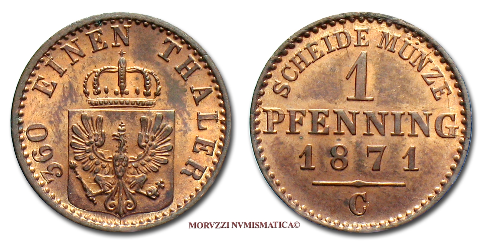 Stati tedeschi, Prussia, GUGLIELMO I, PFENNIG, 1871 C, zecca di Cleve, RAME, FDC, (Jaeger 50) / münzen von Wilhelm I. König von Preußen PFENNING Münzstätte Kleve Stgl. (World silver coins - monete mondiali - monete europee - monete tedesche - moneta)