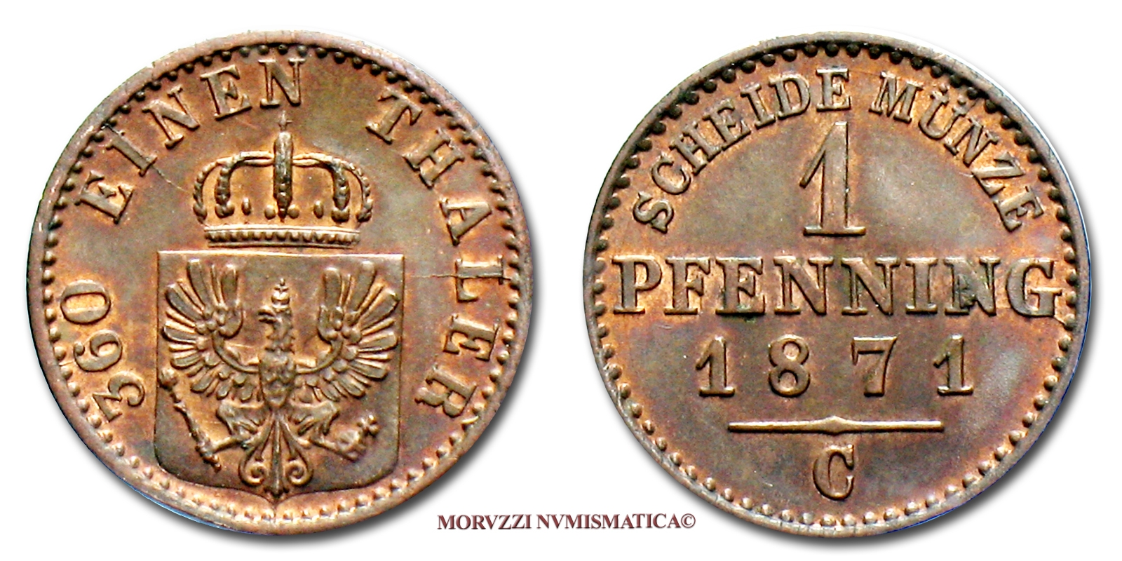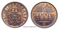 Stati tedeschi, Prussia, GUGLIELMO I, 1861-1888, PFENNIG, Emissione: 1871 C, Zecca di Cleve, Rif. bibl. Jaeger, 50; KM, 480; Metallo: CU, gr. 1,49, (ME137033), Diam.: mm. 17,64, qFDC