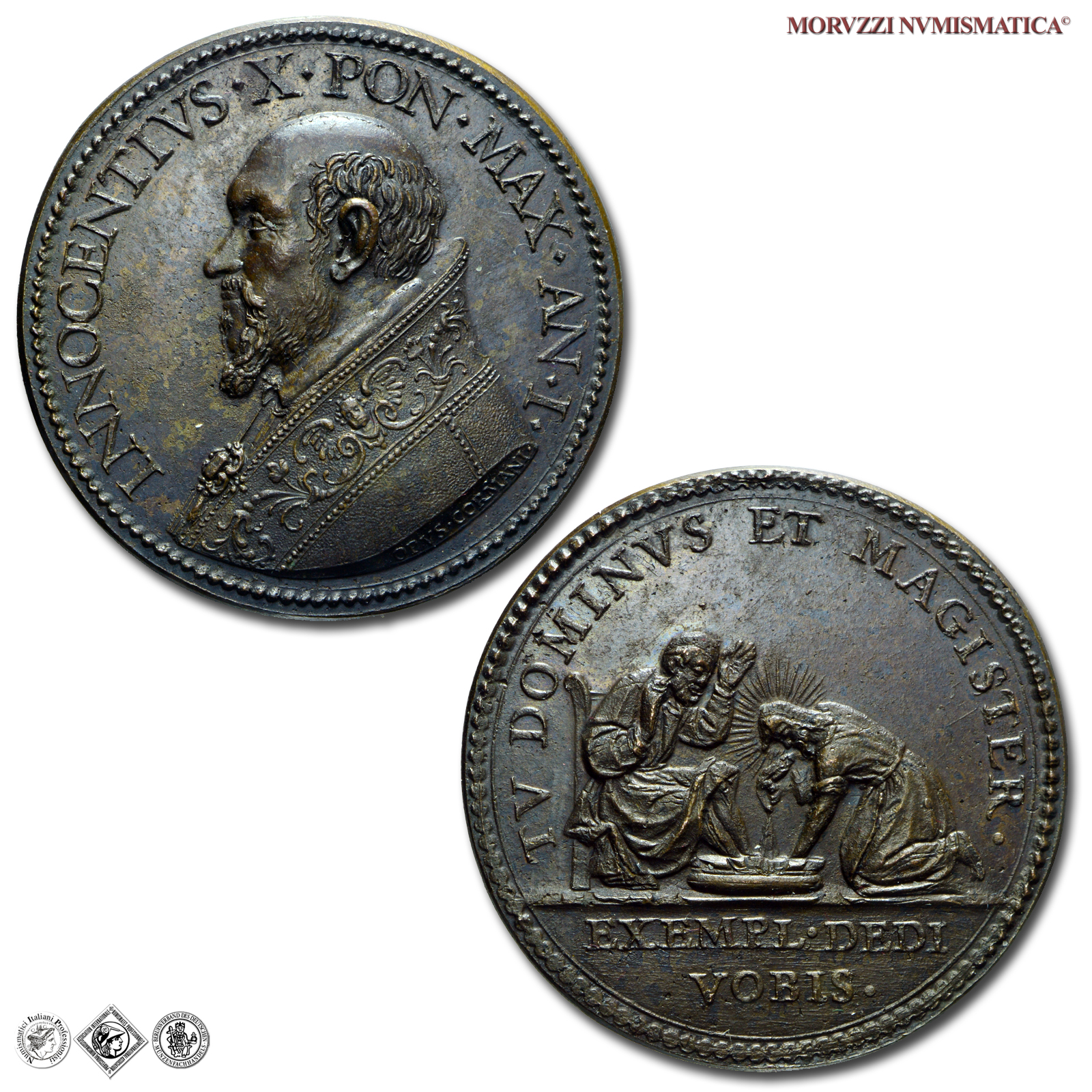 Stato Pontificio, INNOCENZO X, Pamphili, 1644-1655, MEDAGLIA IN BRONZO, Lavanda dei piedi, Emissione: AN I (1644), D/ INNOCENTIVS • X • PON • MAX • AN • I •, busto a s. con piviale; sul taglio spalla: OPVS • CORMANI, R/ TV DOMINVS ET MAGISTER •, Gesú radiato, inginocchiato verso s., lava i piedi a San Pietro; in esergo, su due righe: EXEMPL • DEDI / VOBIS •, Opus Giovanni Cormano, Rif. bibl. Mazio, 223; Miselli, 388; Metallo: AE, gr. 17,63, (MP147768), Diam.: mm. 31,57, qFDC