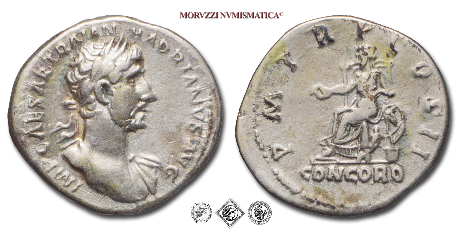 Impero Romano, ADRIANO, 117-138 d.C., DENARIO, Emissione: 118 d.C., D/ IMP CAESAR TRAIAN HADRIANVS AVG, mezzo busto laureato con tracce di paludamento, R/ P M TR P COS II, CONCORD, la Concordia seduta a s. con patera nella d., sotto al sedile una cornucopia, Zecca di Roma, Rif. bibl. R.I.C., 40; Cohen, 252; Metallo: AR, gr. 2,95, (MR162933), Diam.: mm. 19,86, BB