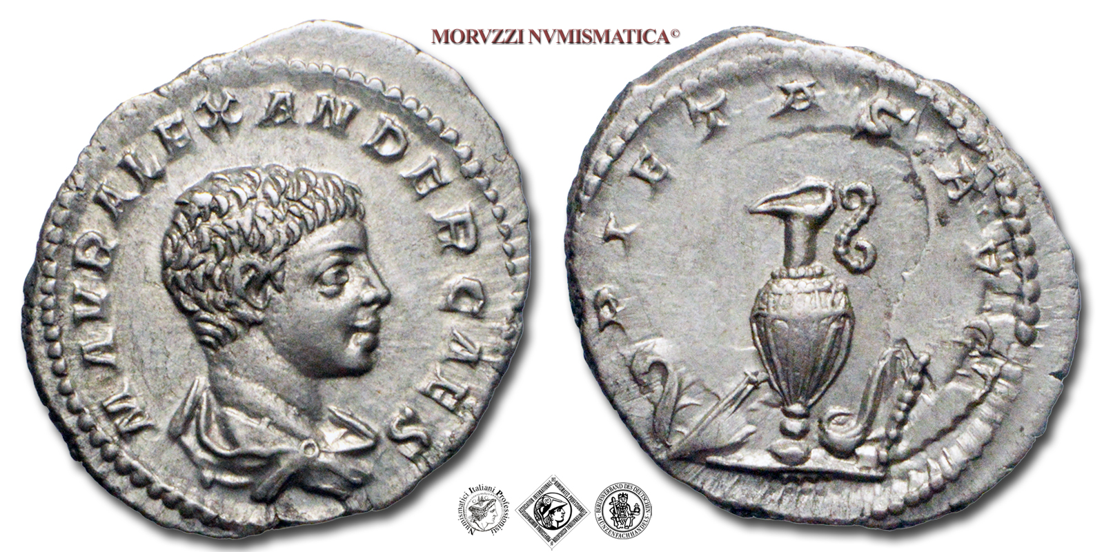 Impero Romano, ALESSANDRO SEVERO, 222-235 d.C., DENARIO, Emissione: 221-222 d.C., D/ M AVR ALEXANDER CAES, busto a testa nuda con paludamento a destra, R/ PIETAS AVG, strumenti sacrificali: lituus, coltello, brocca, simpulum e aspergillum, Zecca di Roma, Rif. bibl. R.I.C., 3; Cohen, 198; Metallo: AR, gr. 3,53, (MR163165), Diam.: mm. 19,90, SPL, (R)