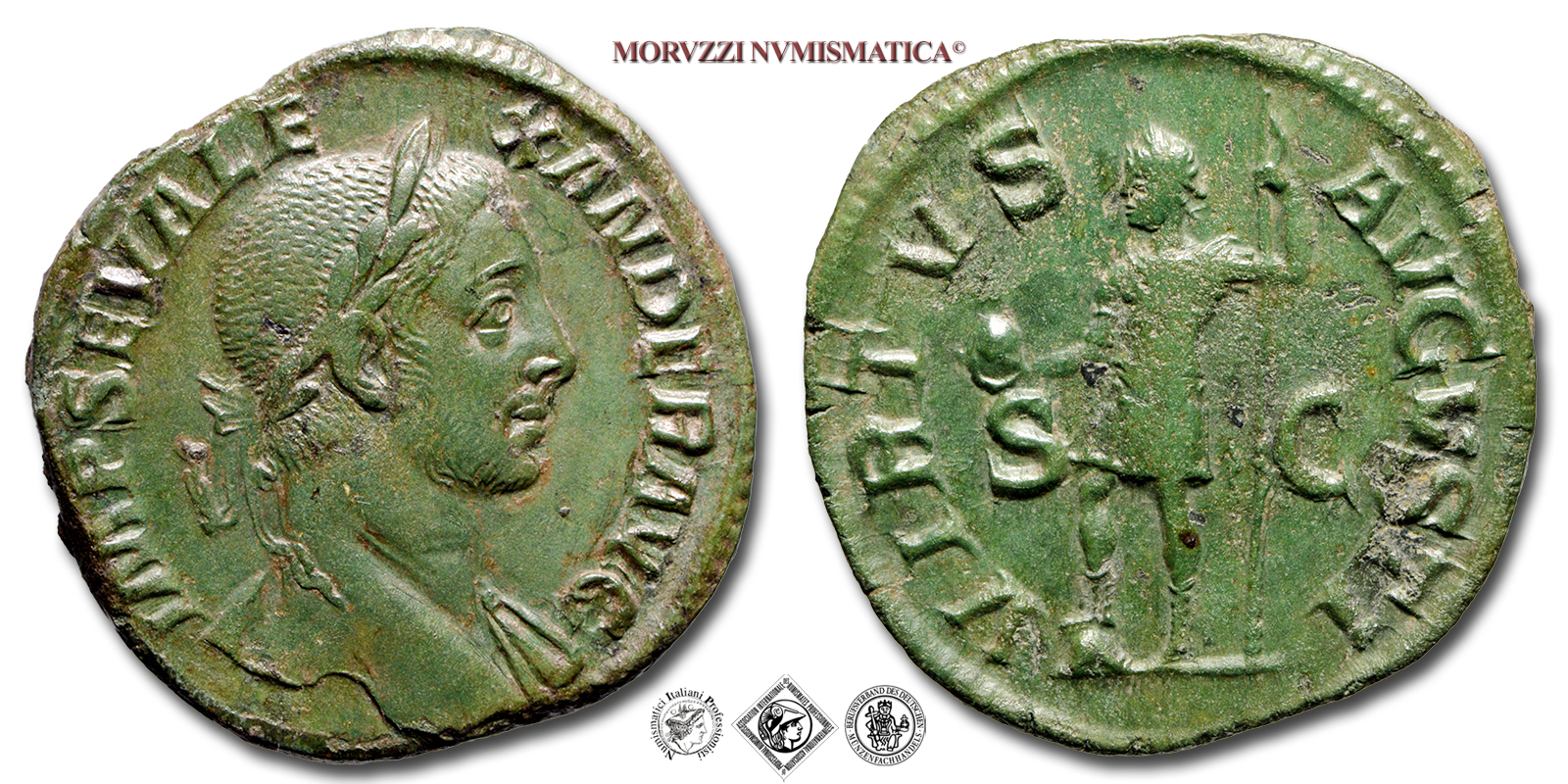 Impero Romano, ALESSANDRO SEVERO, 222-235 d.C., SESTERZIO, Emissione: 222-231 d.C., D/ IMP SEV ALEXANDER AVG, busto laureato a d. con paludamento sulla spalla s., R/ VIRTVS AVGVSTI / S C, l'imperatore in abiti militari stante a s. con il piede d. sopra un elmo, tiene un globo nella d. e la lancia nella s., Zecca di Roma, Rif. bibl. R.I.C., 627; Cohen, 592; Metallo: AE, gr. 19,24, (MR158994), Diam.: mm. 30,33, SPL