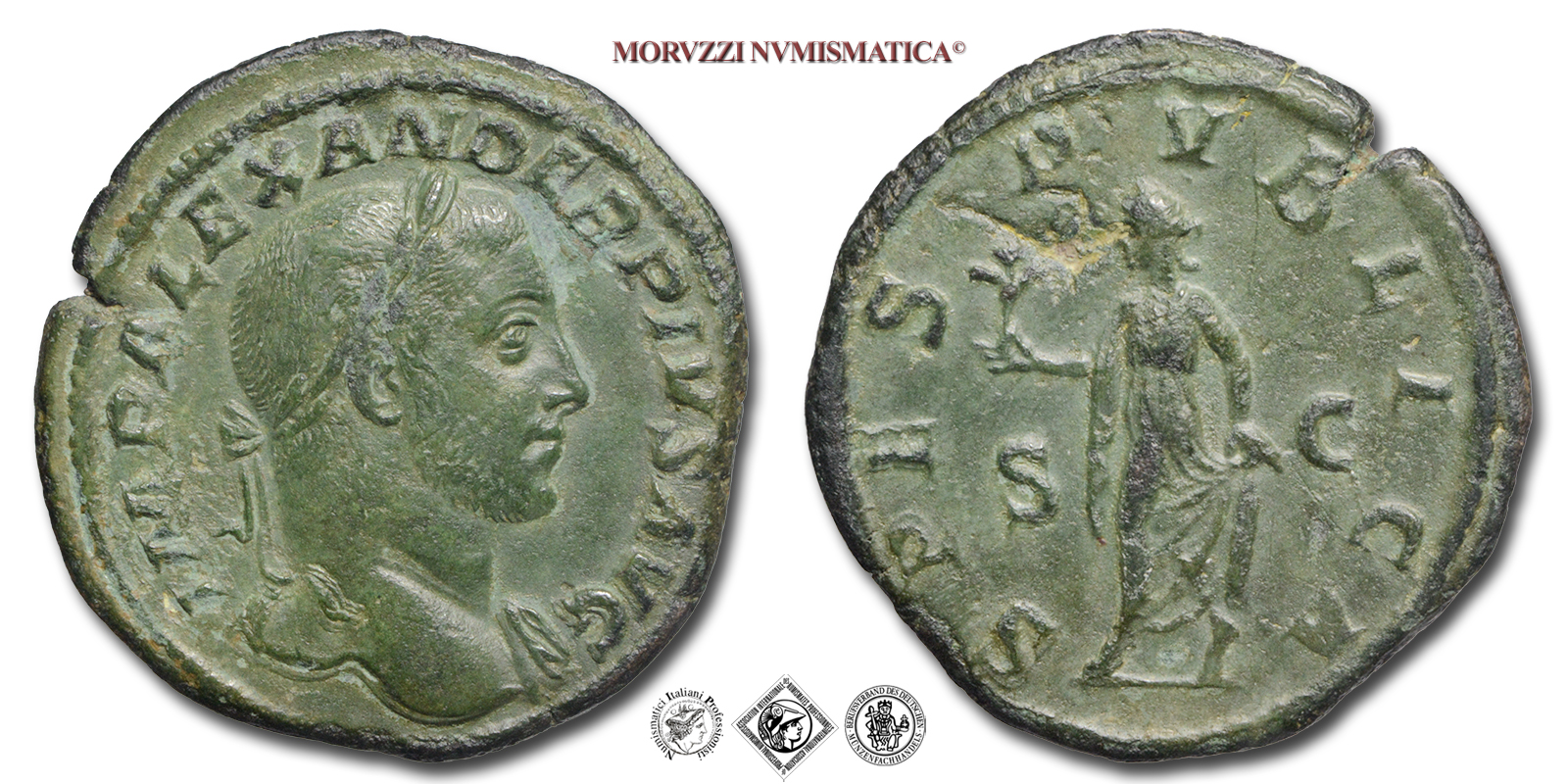 Impero Romano, ALESSANDRO SEVERO, 222-235 d.C., SESTERZIO, Emissione: 231-235 d.C., D/ IMP ALEXANDER PIVS AVG, busto laureato a d. con tracce di paludamento sulla spalla s., R/ SPES PVBLICA, S C, la Spes stante a s. tiene un fiore nella d., Zecca di Roma, Rif. bibl. R.I.C., 648b; Cohen, 548; Metallo: AE, gr. 22,93, (MR160616), Diam.: mm. 28,40, qSPL
