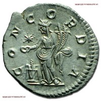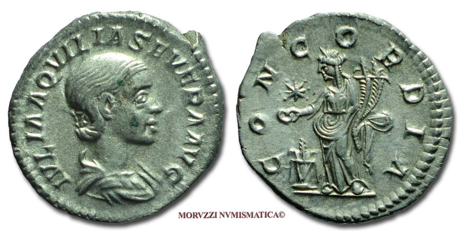 Impero Romano, AQUILIA SEVERA, Moglie di Elagabalo, DENARIO, Emissione: 218-222 d.C., D/ IVLIA AQVILIA SEVERA AVG, busto ammantato a destra, R/ CONCORDIA, la Concordia stante a sinistra con doppia cornucopia nella mano sinistra, sacrifica con patera su un altare con la destra, Zecca di Antiochia*, Rif. bibl. R.I.C., 225/S; Cohen, 2/Fr.20; Metallo: AR, gr. 2,65, (MR142001), Diam.: mm. 18,63, SPL, (R)