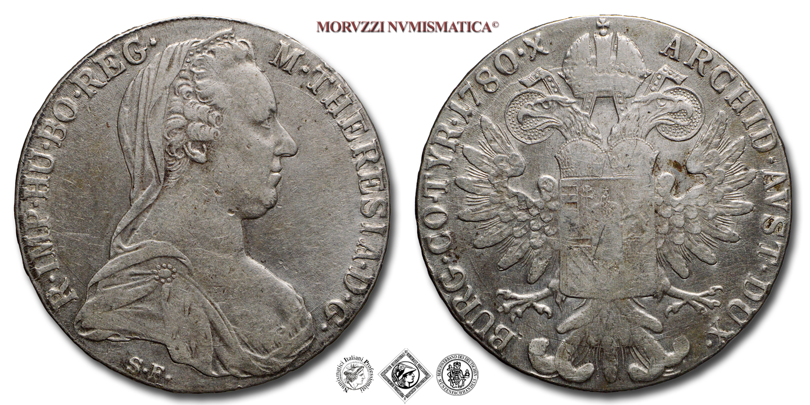 Austria, MARIA TERESA, 1740-1780, TALLERO RICONIO, Emissione: 1780, D/ busto velato di Maria Teresa d'Austria volto a destra. Intorno, M • THERESIA • D • G • R • IMP • HU • BO • REG •. Sotto il busto le iniziali (S • F •) dei responsabili della zecca di Günzburg, R/ aquila bicipite dell'Impero Austro-Ungarico con stemma degli Asburgo sul petto. Lungo il bordo, ARCHID • AUST • DUX • BURG • CO • TYR • 1780 • X, Zecca di Vienna, Rif. bibl. KM, T1; Metallo: AR, gr. 27,90, (ME162490), Diam.: mm. 40,06, BB
