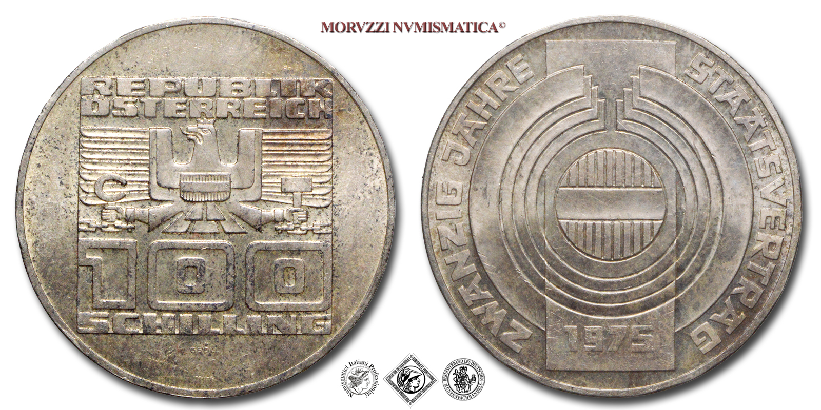 ÖSTERREICH, il riquadro circonda l'aquila imperiale stilizzata, scudo austriaco sul petto, che tiene in mano falce e martello, valore (100 SCHILLING) in basso. Incisore: Helmuth Gsolpointner, R/ STAATSVERTRAG ZWANZIG JAHRE, scudo austriaco rotondo al centro, data (1975) in basso. Incisore: Helmuth Gsolpointner, Zecca di Vienna (Münze Österreich), Rif. bibl. KM, 2924; Metallo: AR, gr. 23,89, (ME148682), Diam.: mm. 36,08, FDC