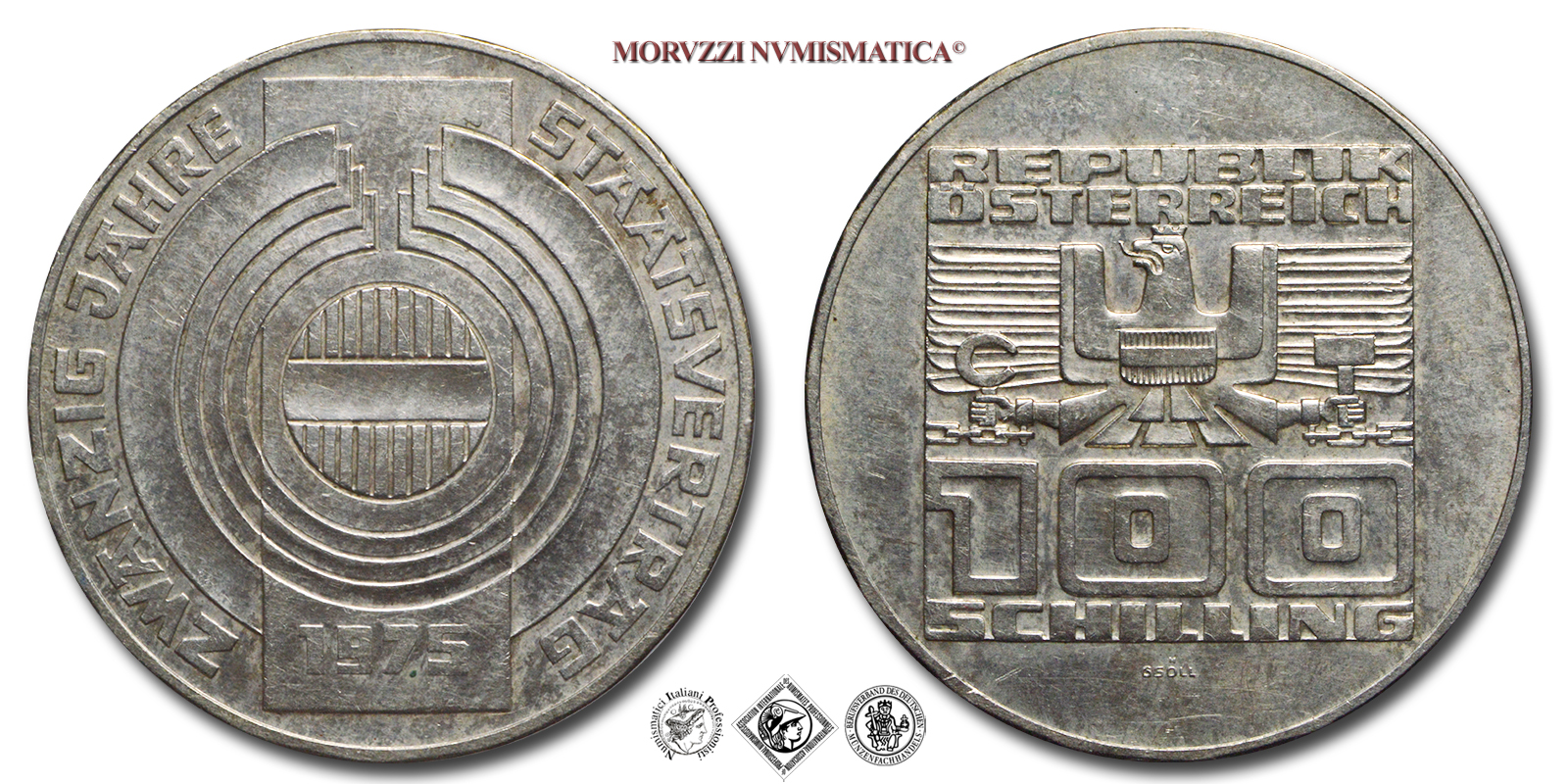 ÖSTERREICH, il riquadro circonda l'aquila imperiale stilizzata, scudo austriaco sul petto, che tiene in mano falce e martello, valore (100 SCHILLING) in basso. Incisore: Helmuth Gsolpointner, R/ STAATSVERTRAG ZWANZIG JAHRE, scudo austriaco rotondo al centro, data (1975) in basso. Incisore: Helmuth Gsolpointner, Zecca di Vienna (Münze Österreich), Rif. bibl. KM, 2924; Metallo: AR, gr. 24,07, (ME161235), Diam.: mm. 34,06, FDC