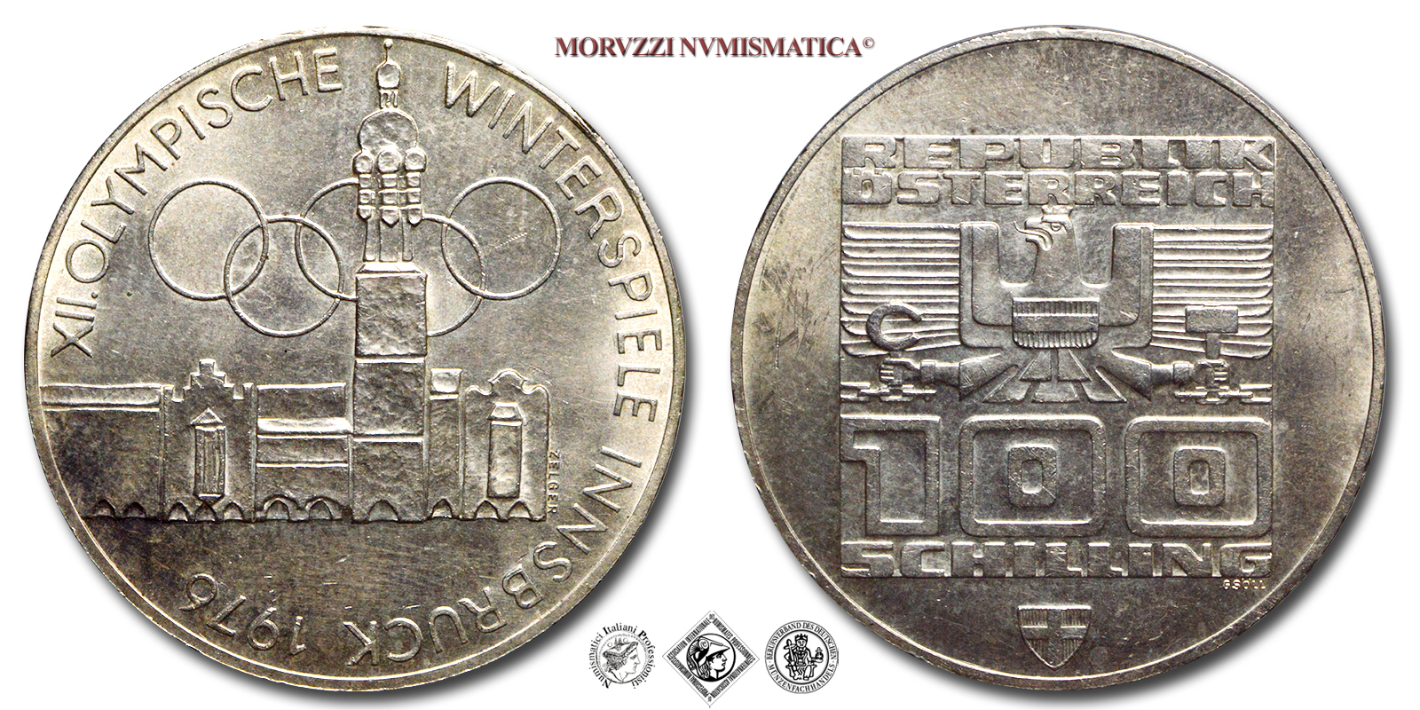 ÖSTERREICH, il riquadro circonda l'aquila imperiale stilizzata, scudo austriaco sul petto, che tiene in mano falce e martello, valore (100 SCHILLING) in basso. Incisore: Helmuth Gsolpointner, R/ XII.OLYMPISCHE WINTERSPIELE INNSBRUCK 1976, edifici e logo olimpico. Incisore: Arthur Zelger, Zecca di Vienna (Münze Österreich), Rif. bibl. KM, 2927; Metallo: AR, gr. 23,92, (ME161236), Diam.: mm. 36,10, FDC