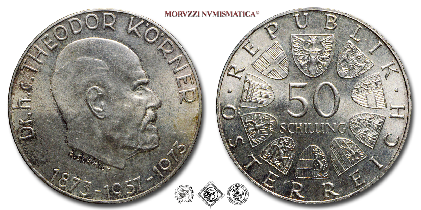 Austria, REPUBBLICA, SCELLINI 50, 100° anniversario della nascita del Dr. Thedor Koerner, Emissione: 1973, D/ · REPUBLIK · ÖSTERREICH, valore (50 SCHILLING) all'interno del cerchio di scudi. Incisore: Rudolf Schmidt, R/ Dr.h.c.THEODOR KÖRNER, testa del Dr. Theodor Korner, a destra, tre date (1873-1957-1973) in basso. Incisore: Edwin Grienauer, Zecca di Vienna (Münze Österreich), Rif. bibl. KM, 2917; Metallo: AR, gr. 20,12, (ME161234), Diam.: mm. 34,13, FDC