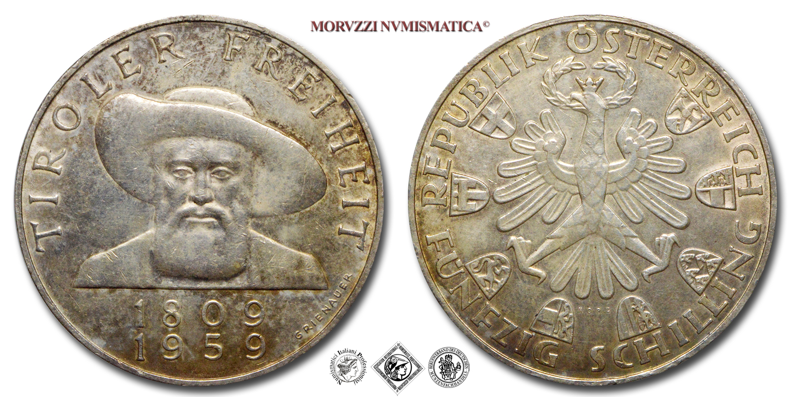 Austria, REPUBBLICA, SCELLINI 50, 150° anniversario della liberazione del Tirolo, Emissione: 1959, D/ REPUBLIK ÖSTERREICH FÜNFZIG SCHILLING, aquila imperiale entro 3/4 di cerchio di scudi, corona che cinge la testa. Incisore: Michael Norz, R/ TIROLER FREIHEIT, Andreas Hofer rivolto in avanti, due date (1809 1959) in basso. Incisore: Edwin Grienauer, Zecca di Vienna (Münze Österreich), Rif. bibl. KM, 2888; Metallo: AR, gr. 20,02, (ME141455), Diam.: mm. 33,93, mSPL