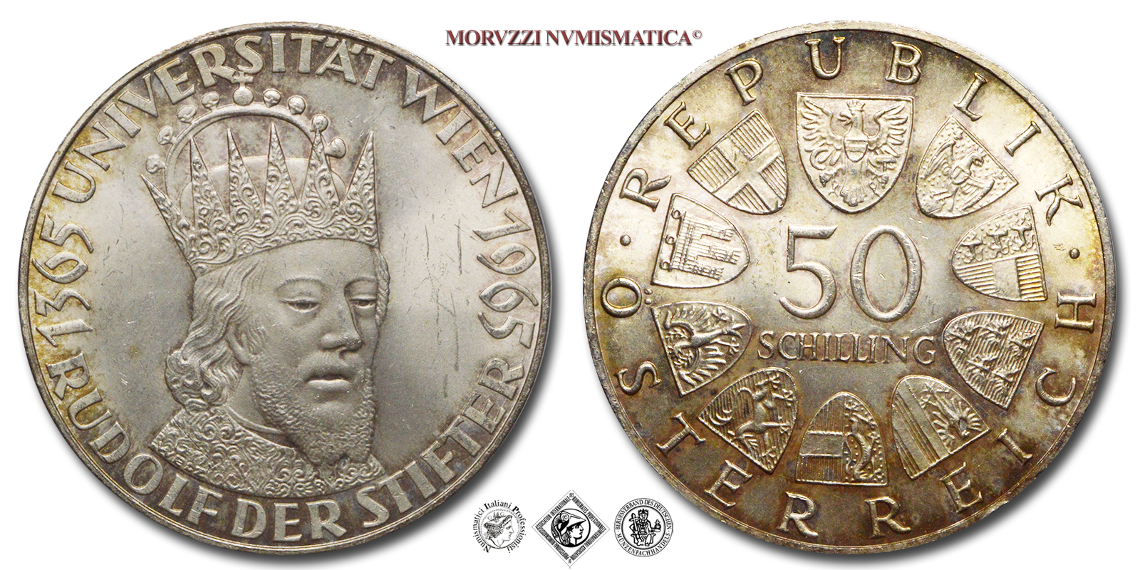 Austria, REPUBBLICA, SCELLINI 50, 600° Anniversario Università di Vienna, Emissione: 1965, D/ · REPUBLIK · ÖSTERREICH, valore (50 SCHILLING) all'interno del cerchio di stemmi. Incisore: Edwin Grienauer, R/ 1365 UNIVERSITÄT.WIEN 1965 RUDOLF DER STIFTER, testa coronata del duca Rodolfo IV ("Rodolfo il Fondatore") di 3/4 a destra. Incisore: Ferdinand Welz, Zecca di Vienna (Münze Österreich), Rif. bibl. KM, 2898; Metallo: AR, gr. 19,97, (ME141453), Diam.: mm. 33,95, FDC