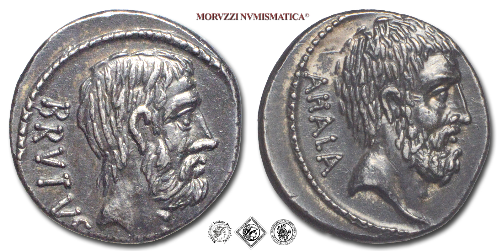 Repubblica Romana, BRUTO, DENARIO, Emissione: 54 a.C., D/ BRVTVS, testa nuda di L. Iunius Brutus a destra, R/ AHALA, testa nuda di Servilius Ahala a destra, Zecca di Roma, Rif. bibl. Craw., 433/2; Bab., 30; Syd., 907; Metallo: AR, gr. 4,08, (MR160216), Diam.: mm. 17,32, SPL