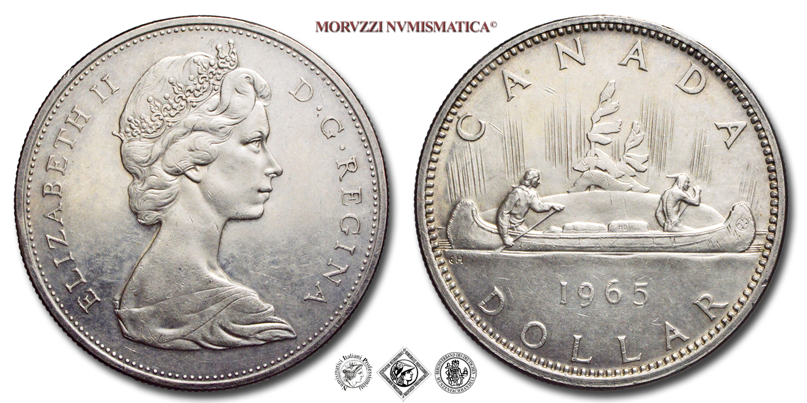 Canada, ELISABETTA II, 1952-2022, DOLLARO, Voyageur, Emissione: 1965, D/ ELIZABETH II D·G·REGINA, busto della regina Elisabetta II, all'età di 37 anni, con indosso la tiara, rivolto a destra. Incisore: Walter Ott. Designer: Arnold Machin, R/ CANADA, un viaggiatore e un aborigeno che navigano in canoa, trasportando fagotti di cui uno porta le iniziali "HB" per la Compagnia della Baia di Hudson, con il millesimo (1965) e la denominazione (DOLLAR); nel campo, a sinistra, lungo il bordo: EH. Incisore: Thomas Shingles. Designer: Emanuel Otto Hahn, Royal Canadian Mint of Ottawa, Rif. bibl. KM, 64.1; Metallo: AR, gr. 23,25, (ME163022), Diam.: mm. 35,94, qFDC