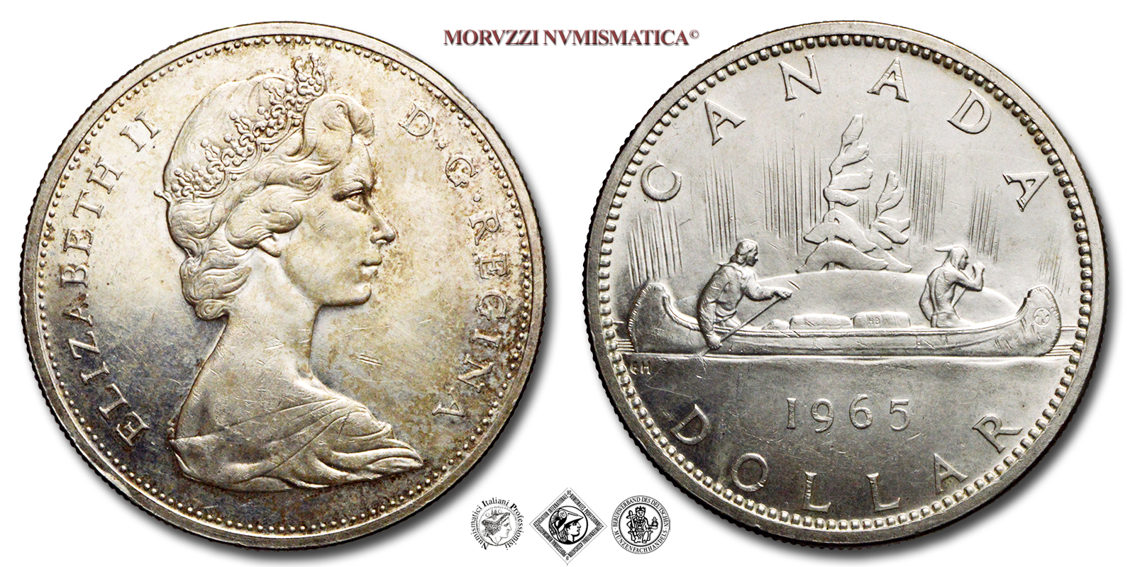 Canada, ELISABETTA II, 1952-2022, DOLLARO, Voyageur, Emissione: 1965, D/ ELIZABETH II D·G·REGINA, busto della regina Elisabetta II, all'età di 37 anni, con indosso la tiara, rivolto a destra. Incisore: Walter Ott. Designer: Arnold Machin, R/ CANADA, un viaggiatore e un aborigeno che navigano in canoa, trasportando fagotti di cui uno porta le iniziali "HB" per la Compagnia della Baia di Hudson, con il millesimo (1965) e la denominazione (DOLLAR); nel campo, a sinistra, lungo il bordo: EH. Incisore: Thomas Shingles. Designer: Emanuel Otto Hahn, Royal Canadian Mint of Ottawa, Rif. bibl. KM, 64.1; Metallo: AR, gr. 23,53, (ME163025), Diam.: mm. 36,05, FDC