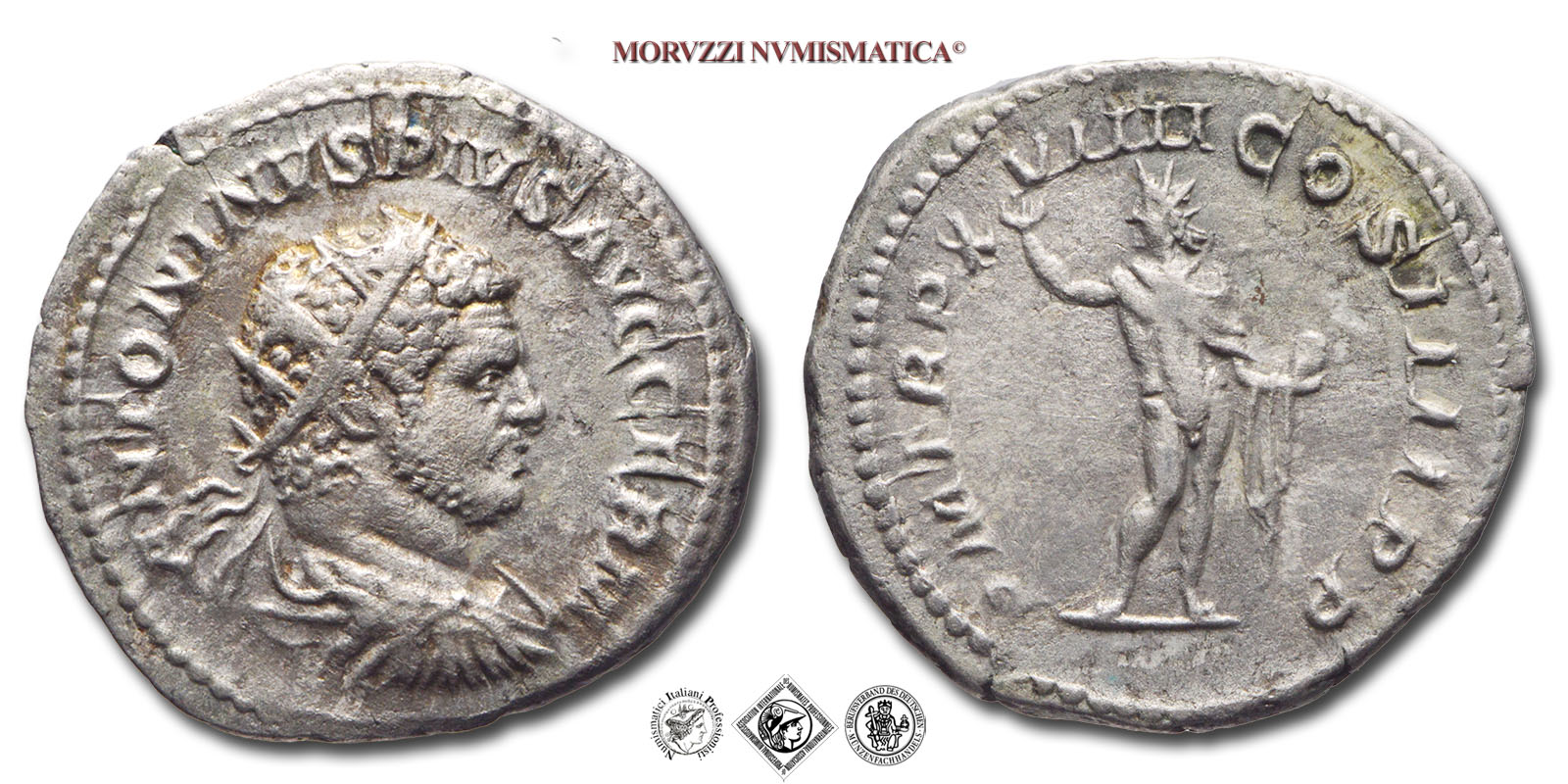 Impero Romano, CARACALLA, 198-217 d.C., ANTONINIANO, Emissione: 215 d.C., D/ ANTONINVS PIVS AVG GERM, testa laureata a destra, R/ P M TR P XVIII COS IIII P P, il Sole stante di fronte, la testa volta a sinistra, leva la mano destra e con la sinistra sorregge un globo, Zecca di Roma, Rif. bibl. R.I.C., 264a; Cohen, 288; Metallo: AR, gr. 4,42, (MR11234), Diam.: mm. 23,55, BB