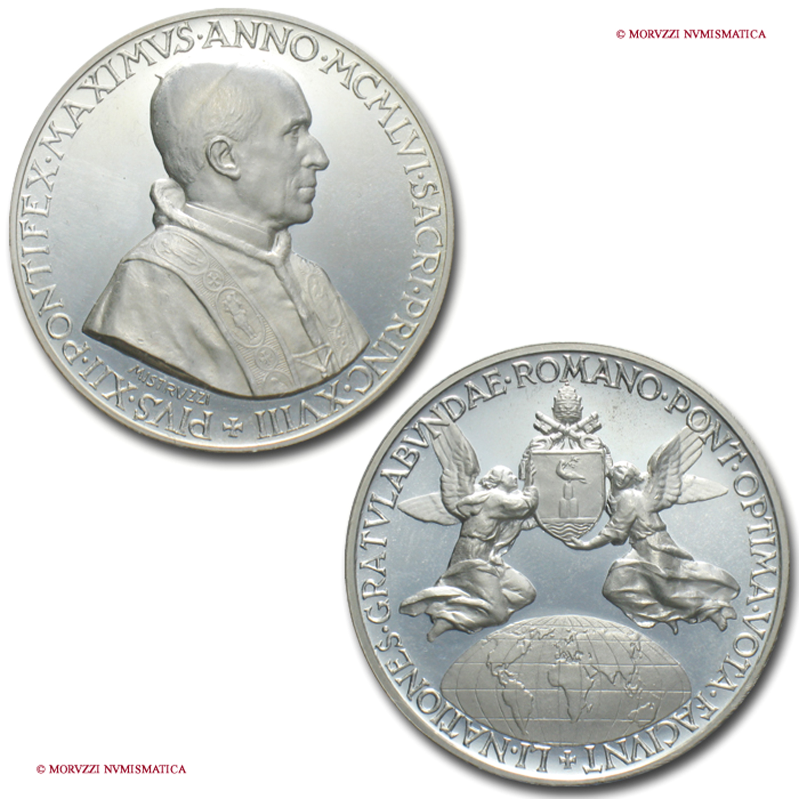 Omaggio mondiale al pontificato di Pio XII, Emissione: 1956, Opus Aurelio Mistruzzi, Rif. bibl. Cusumano, Modesti, 251; Metallo: AR, gr. 37,39, (MP55342), Diam.: mm. 44,00, FDC