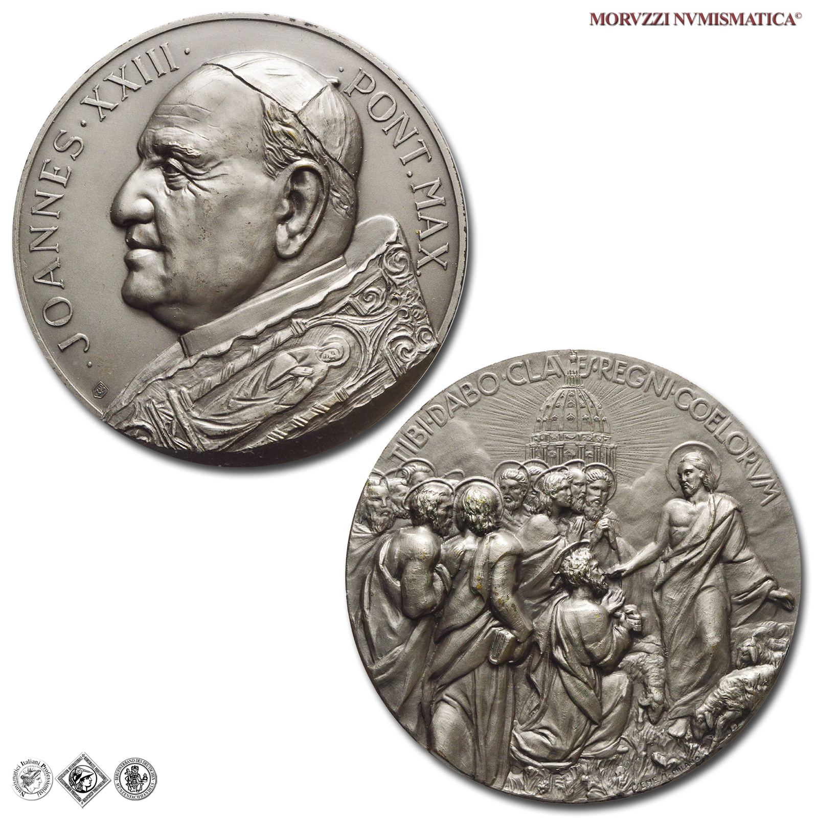 Città del Vaticano, GIOVANNI XXIII, Roncalli, 1958-1963, MEDAGLIA, Tibi dabo claves regni, Emissione: 1958, D/ . JOANNES • XXIII • _ PONT • MAX •, busto a s. con berretto e piviale, R/ TIBI • DABO • CLA _ VES • REGNI • COELORVM, Gesú, attorniato dagli Apostoli, consegna le chiavi a San Pietro, sullo sfondo la Basilica Vaticana; in basso a d.: SENESI • MILANO, Opus Enrico Manfrini, Rif. bibl. Calò, 42 bis; Metallo: WM, gr. 102,57, (MP146983), Diam.: mm. 60,14, qFDC, (R)