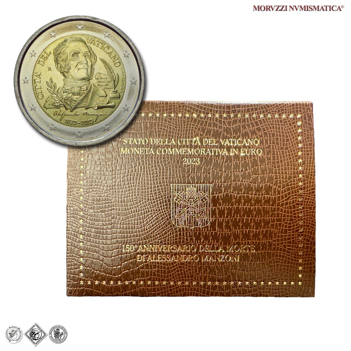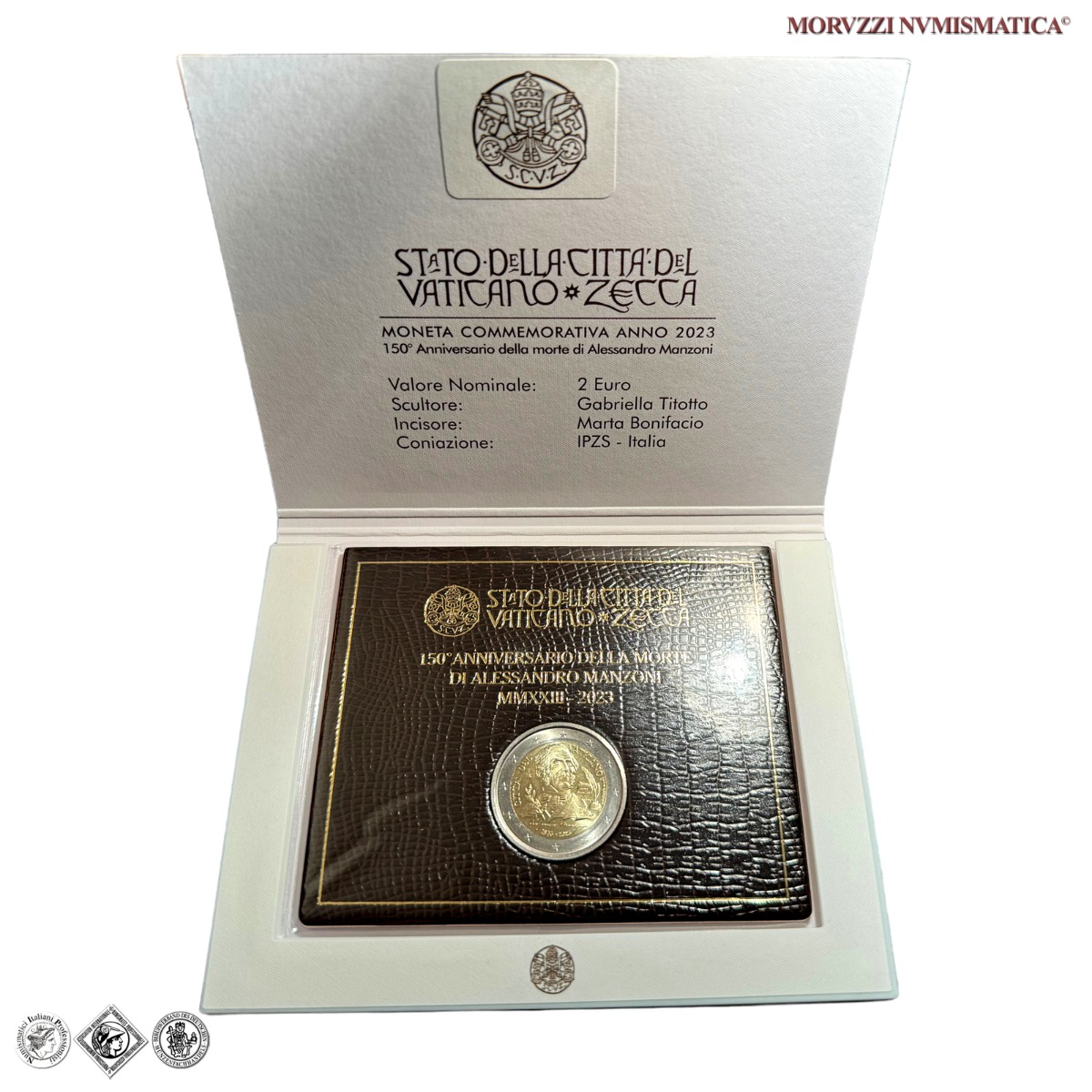 Città del Vaticano, FRANCESCO, Bergoglio, 2 euro commemorativo 2023, Moneta bimetallica da due euro commemorativa del 150° anniversario della morte di Alessandro Manzoni, D/ al centro il volto dello scrittore con sotto la sua firma; sulla destra, dietro il calamaio e la penna d’oca, è riportato l’incipit del celeberrimo romanzo storico “I Promessi Sposi”. A sinistra troviamo il ramo d’alloro a testimoniare la fama immortale del grande scrittore, R/ 2 EURO, mappa dell'Unione Europea e le 12 stelle dei paesi fondatori della moneta unica; LL nella parte esterna, nella confezione originale della zecca di Roma, Metallo: CU/NI, gr. 8,50, Diam.: mm 25,75, FDC