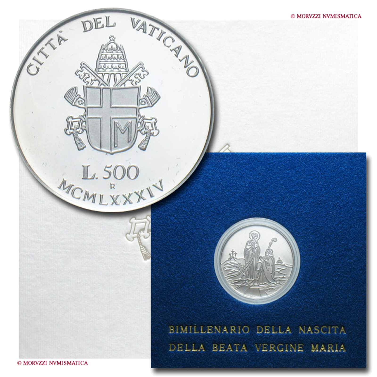 Città del Vaticano, GIOVANNI PAOLO II, Woityla, 1978-2005, LIRE 500, Bimillenario Beata Vergine Maria, Emissione: 1984 nella confezione originale della zecca, Zecca di Roma, Rif. bibl. Unif., GPA2.620; Metallo: AR, gr. 11,00, Diam.: mm. 29,10, FS