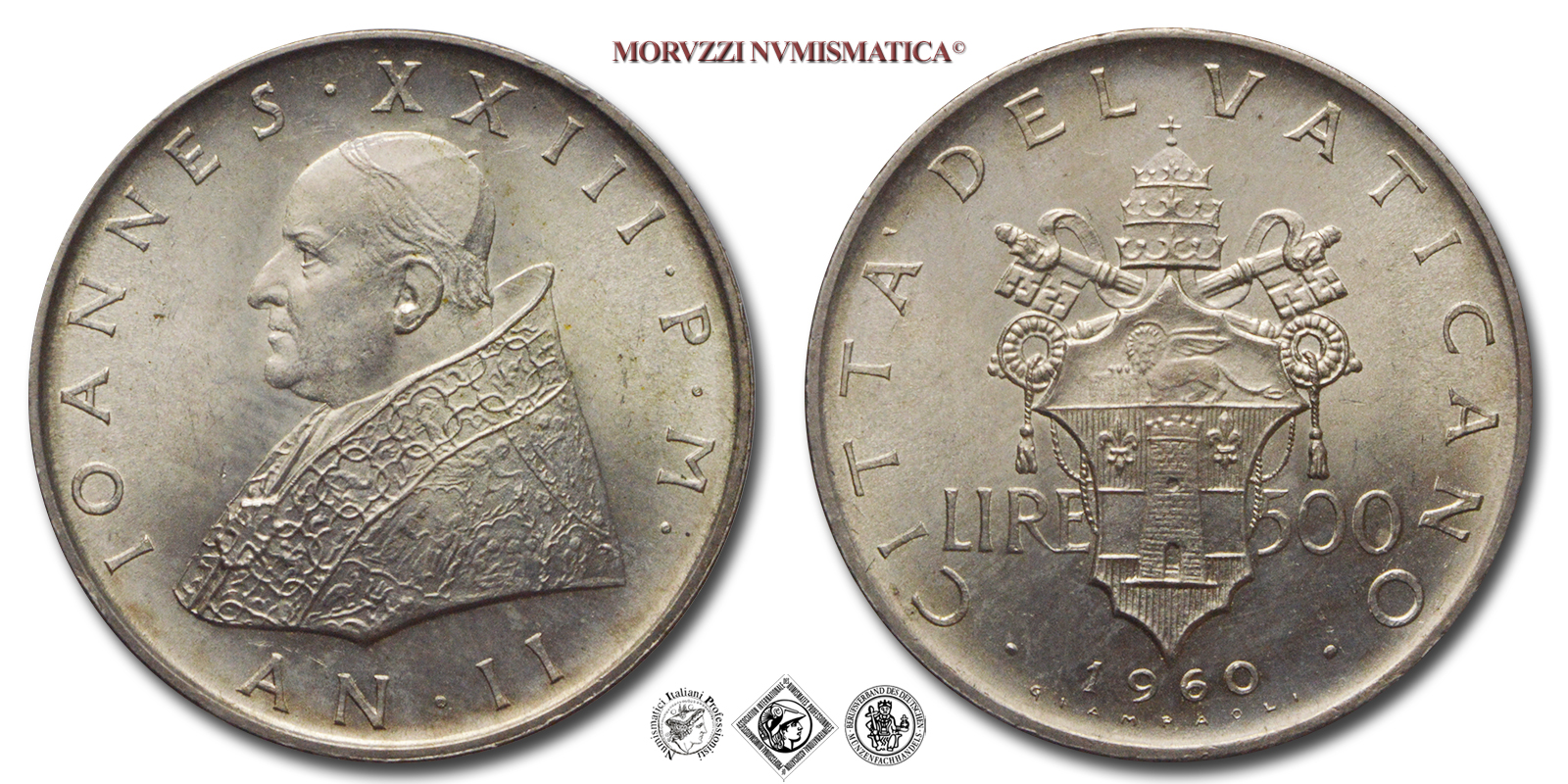 Città del Vaticano, GIOVANNI XXIII, Roncalli, 1958-1963, LIRE 500, Emissione: 1960 AN II, D/ IOANNES • XXIII • P • M • AN • II, busto in paramenti clericali con pileo rivolto a sinistra, R/ CITTA' DEL VATICANO, stemma sormontato da tiara su chiavi decussate incrociate; nel campo, la denominazione divisa (LIRE 500); sotto: data (• 1960 •) e indicazione dell'incisore (GIAMPAOLI). Lettere in rilievo lungo il bordo, Zecca di Roma, Rif. bibl. Pagani, 852; Metallo: AR, gr. 11,02, (MX134385), Diam.: mm. 29,23, FDC