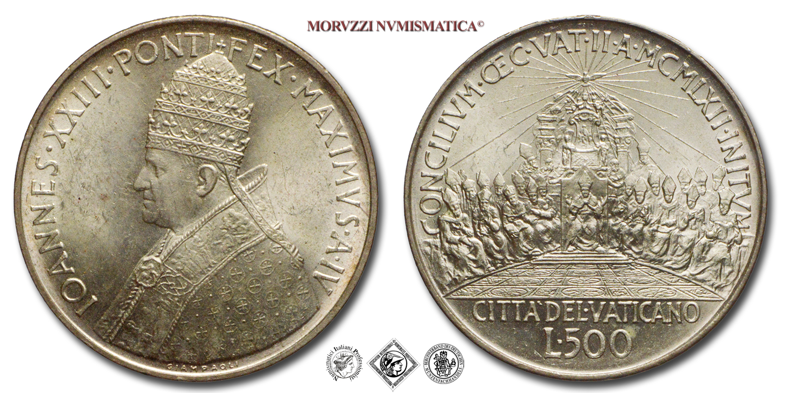 Città del Vaticano, GIOVANNI XXIII, Roncalli, 1958-1963, LIRE 500, Concilio Ecumenico Vaticano II, Emissione: 1962, D/ IOANNES·XXIII·PONTIFEX·MAXIMVS A·IV, Busto coronato a sinistra. Incisore: Pietro Giampaoli, R/ CONCILIVM·CEC·VAT·II·A·MCMLXII·INITVM, I vescovi al concilio con le colombe radiose; in esergo, su due righe: CITTA' DEL VATICANO e la denominazione (L·500). Incisore: Pietro Giampaoli, Zecca di Roma, Rif. bibl. Pagani, 855; Metallo: AR, gr. 11,02, (MX134382), Diam.: mm. 29,17, FDC