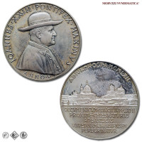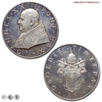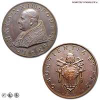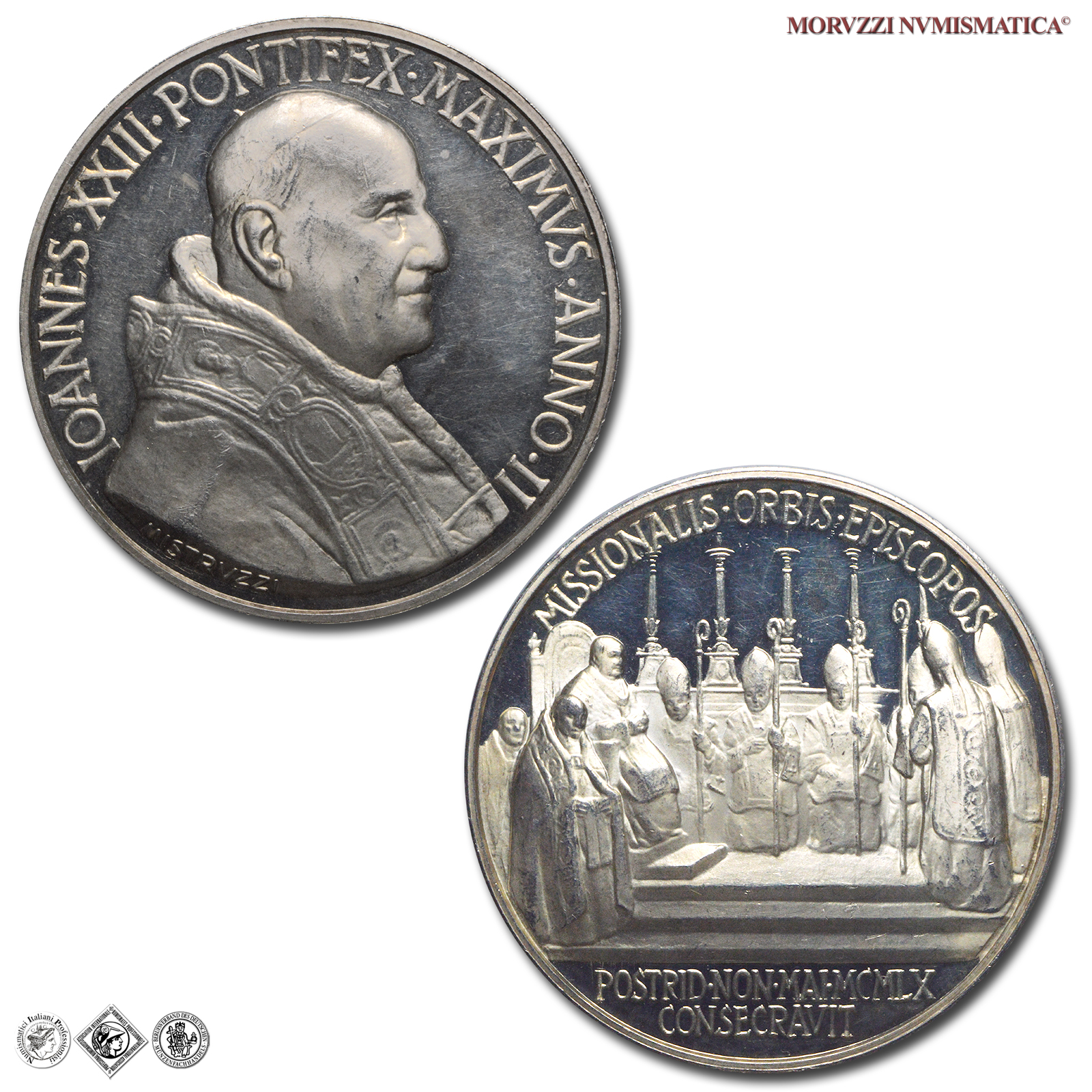 Città del Vaticano, GIOVANNI XXIII, Roncalli, 1958-1963, MEDAGLIA, Consacrazione di vescovi missionari, Emissione: 1960 ANNO II, D/ IOANNES • XXIII • PONTIFEX • MAXIMVS • AN • II, busto con berretto, mozzetta e stola a d., R/ MISSIONALIS • ORBIS • EPISCOPOS, il Papa seduto in trono, davanti ad un altare, circondato dai vescovi con mitra, pianeta e basculus nella mano sinistra; in esergo, su due righe: POSTRID • NON • MAI • MCMLX / CONSECRAVIT, Opus Aurelio Mistruzzi, Rif. bibl. Bart., E960; Modesti, 95; Metallo: AR, gr. 40,52, (MP160663), Diam.: mm. 44,00, FDC, (NC)