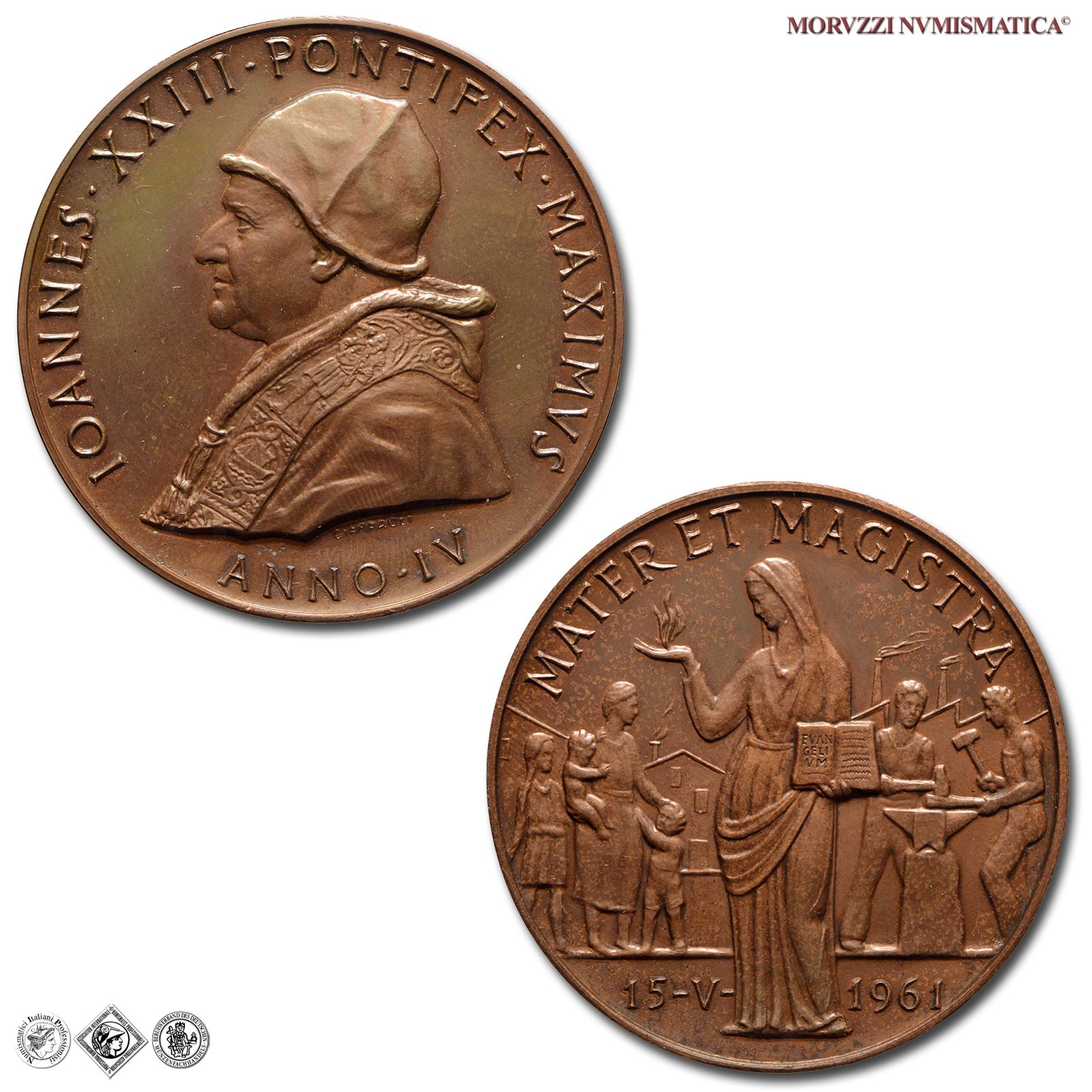 Città del Vaticano, GIOVANNI XXIII, Roncalli, 1958-1963, MEDAGLIA, Enciclica Mater et Magistra, Emissione: (1962) A. IV, D/ IOANNES • XXIII • PONTIFEX • MAXIMVS, busto con mozzetta, camauro e stola a sinistra; sotto: GIAMPAOLI; in basso: ANNO • IV, R/ MATER ET MAGISTRA, la Chiesta stante a s. con il Vangelo e un germoglio, dietro una madre con tre fanciulli e due operai; in esergo: 15-V- _ 1961, Opus Pietro Giampaoli, Rif. bibl. Bart., E962; Metallo: AE, gr. 32,59, (MX147119), Diam.: mm. 43,90, FDC