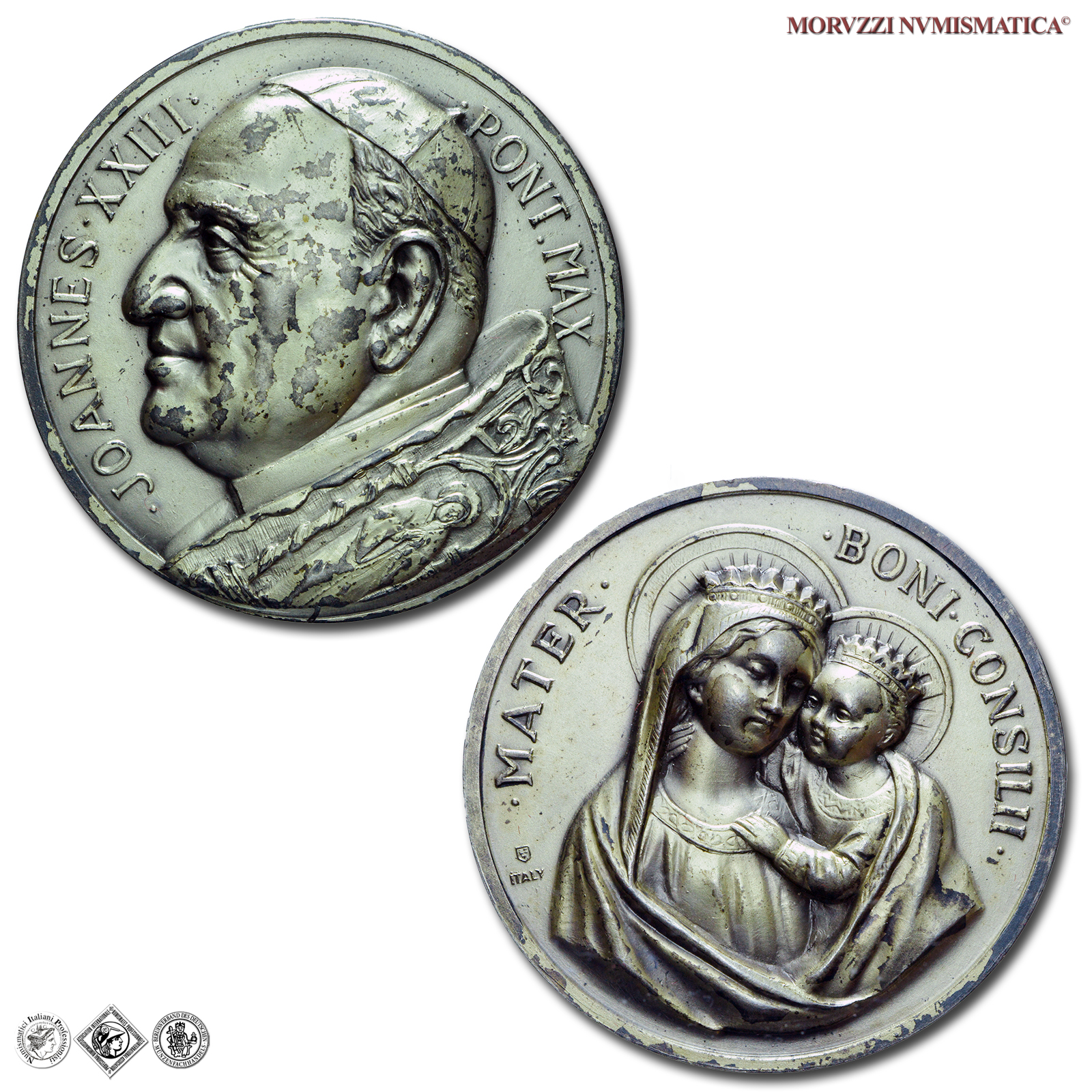 Citta del Vaticano, GIOVANNI XXIII, Roncalli, MEDAGLIA, Madonna del Buon Consiglio, Emissione: senza data, D/ . JOANNES • XXIII • _ • PONT • MAX, busto a s. con zucchetto, mozzetta e stola, R/ . MATER • _ • BONI • CONSILII •, busto velato, nimbato e coronato della B. V. Maria col Bambino Gesú coronato e nimbato; in basso, a sinistra: ITALY, Rif. bibl. Macrí-Marinelli, 489; Metallo: MB, gr. 65,41, (MP153375), Diam.: mm. 49,84, mBB
