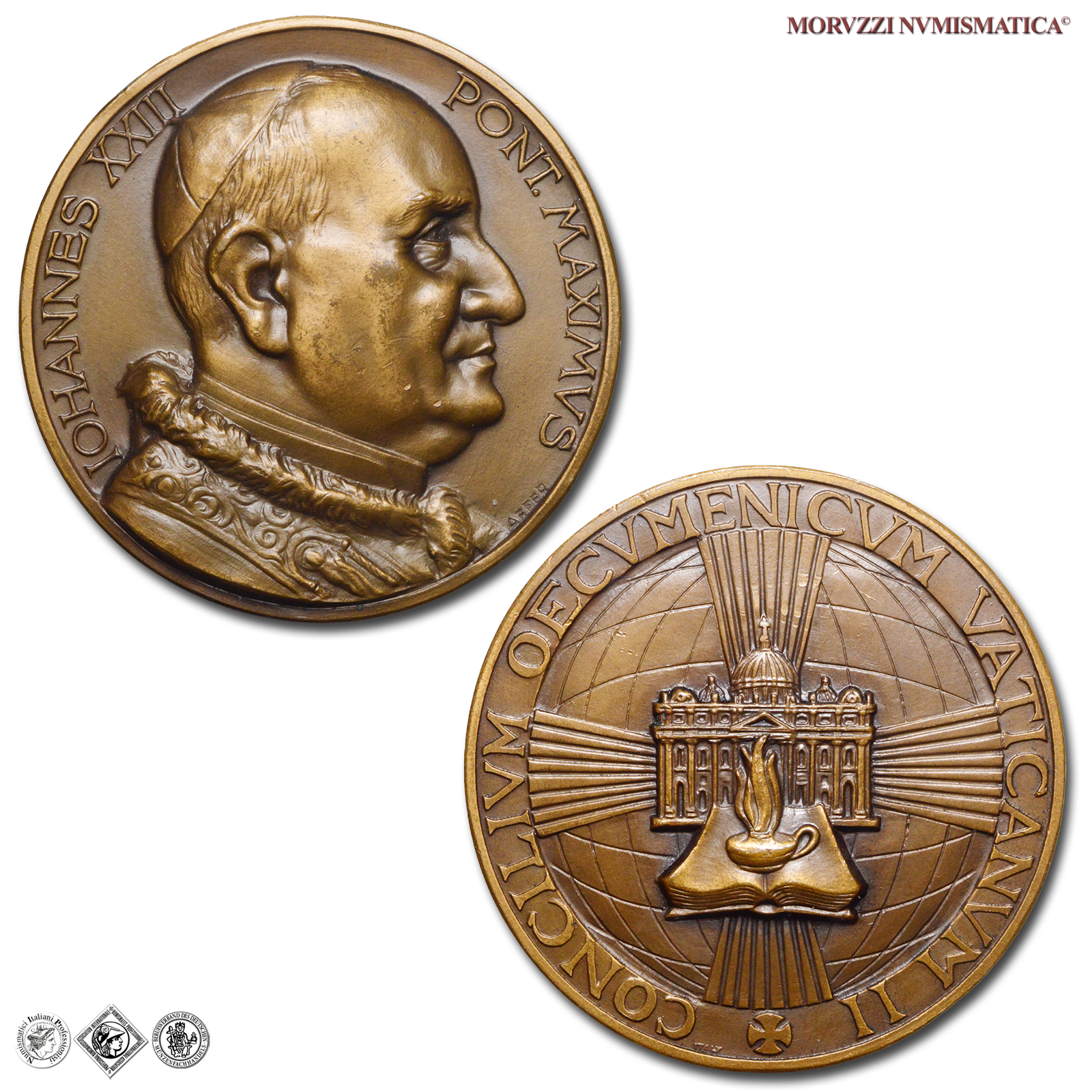 Città del Vaticano, GIOVANNI XXIII, Roncalli, 1958-1963, MEDAGLIA, Concilio Vaticano II - San Pietro con lampada, Emissione: 1962, D/ IOHANNES XXIII _ PONT. MAXIMVS, busto a d. con berretto, mozzetta d'ermellino e stola; in basso, a d.: AFFER, R/ CONCILIVM OECVMENICVM VATICANVM II ✠, prospetto anteriore della Basilica di San Pietro in Roma raggiante a Croce sul globo e con alla base lampada ardente su Vangelo aperto; in basso, a s.: ITALY, Opus Costantino Affer, Rif. bibl. Modesti, 191; Metallo: AE, gr. 71,88, (MP141013), Diam.: mm. 50,19, FDC, (NC)