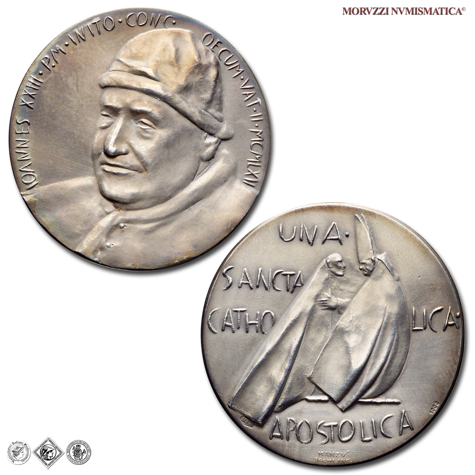 Città del Vaticano, GIOVANNI XXIII, Roncalli, 1958-1963, MEDAGLIA, Convocazione del Concilio Vaticano II, Emissione: 1962, D/ IOANNES XXIII • P.M • INITO • CONC • _ OECUM • VAT • II • MCMLXII, busto di 3/4 a s. con camauro e mozzetta d'ermellino, R/ il Papa in piedi verso s. con mitra e mantello, riceve l'omaggio di un Padre Conciliare; nel campo, su quattro righe: UNA • / SANCTA / CATHO _ LICA • / APOSTOLICA; sotto, su due righe: MANZU' / 3CCHI INC., Opus Giacomo Manzú, Rif. bibl. Modesti, 150; De Luca, 305; Metallo: AR, gr. 14,92, (MP141012), Diam.: mm. 34,95, qFDC
