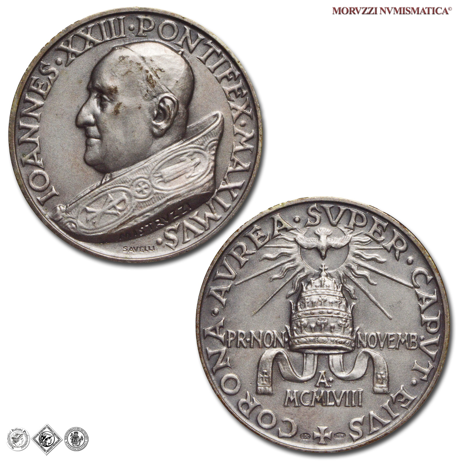 Città del Vaticano, GIOVANNI XXIII, Roncalli, 1958-1963, MEDAGLIA, Incoronazione, Emissione: 1958, D/ IOANNES • XXIII • PONTIFEX • MAXIMVS •, busto a s. con berretto e piviale; sul taglio spalla: MISTRVZZI; sotto: SAVELLI, R/ CORONA • AVREA • SVPER • CAPVT • EIVS +, triregno irraggiato dalla colomba dello Spirito Santo; ai lati PR • NON _ NOVEMBR •; sotto: A • / MCMLVIII, Opus Aurelio Mistruzzi, Rif. bibl. Modesti, 40; De Luca, 276; Metallo: AR, gr. 12,25, (MP146943), Diam.: mm. 30,05, FDC, (R)