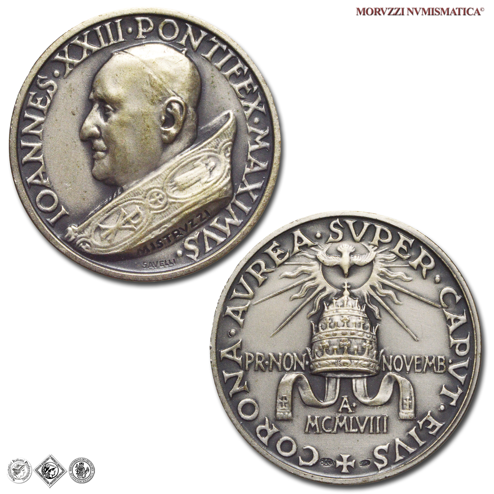 Città del Vaticano, GIOVANNI XXIII, Roncalli, 1958-1963, MEDAGLIA, Incoronazione, Emissione: 1958, D/ IOANNES • XXIII • PONTIFEX • MAXIMVS •, busto a s. con berretto e piviale; sul taglio spalla: MISTRVZZI; sotto: SAVELLI, R/ CORONA • AVREA • SVPER • CAPVT • EIVS +, triregno irraggiato dalla colomba dello Spirito Santo; ai lati PR • NON _ NOVEMBR •; sotto: A • / MCMLVIII, Opus Aurelio Mistruzzi, Rif. bibl. Modesti, 40; De Luca, 276; Metallo: AR, gr. 14,18, (MP146944), Diam.: mm. 30,44, FDC, (R)