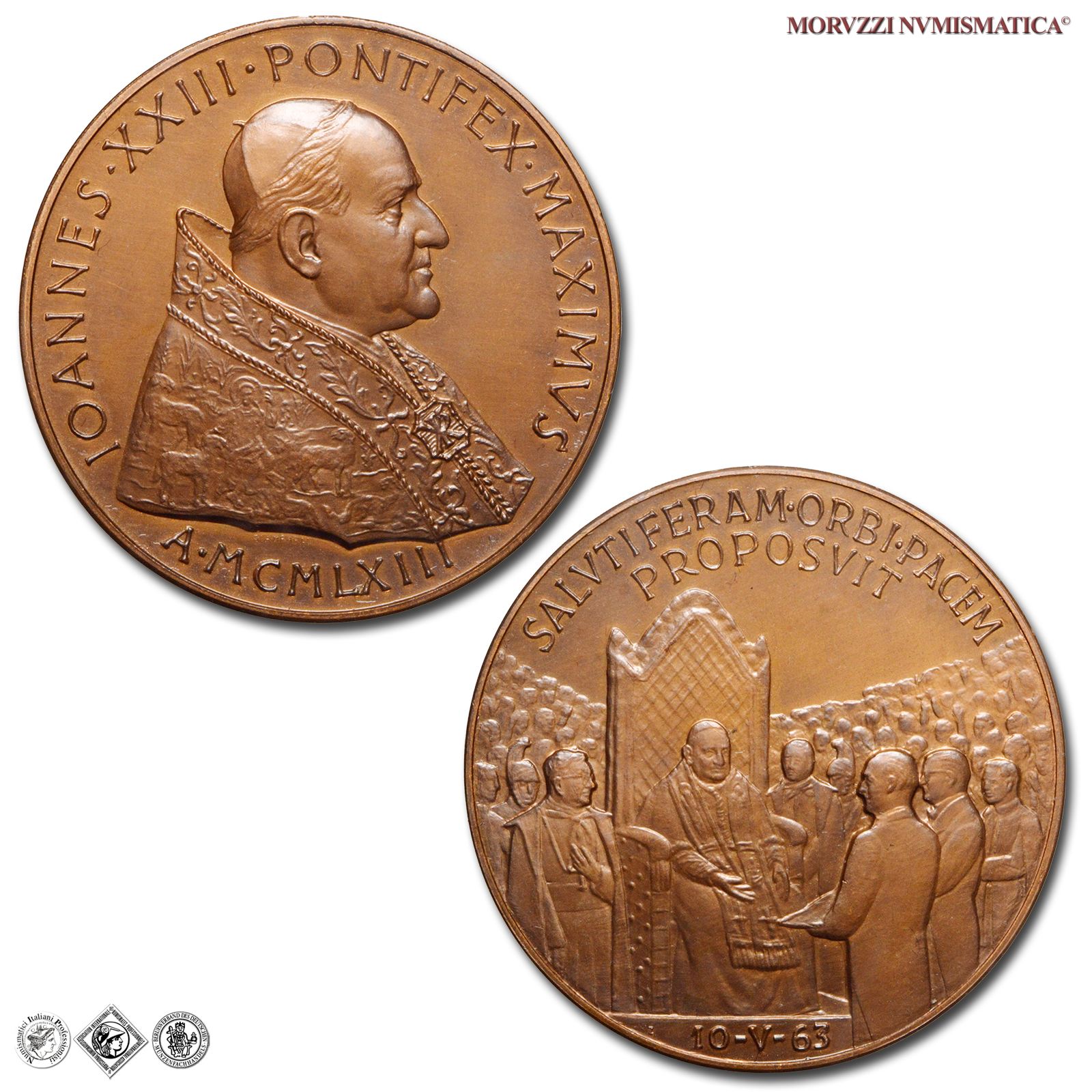 Città del Vaticano, GIOVANNI XXIII, Roncalli, 1958-1963, MEDAGLIA, Premio Balzan per la pace, Emissione: 1963, D/ IOANNES • XXIII • PONTIFEX • MAXIMVS, busto con zucchetto, mozzetta e stola a s.; sotto: A • MCMLXIII, R/ SALVTIFERAM • ORBI • PACEM / PROPOSVIT, il papa in trono, attorniato dalla folla, riceve il premio Balzan della pace; in esergo: 10-V-63, Opus Pietro Giampaoli, Rif. bibl. Modesti, 271; Metallo: AE, gr. 36,25, (MP153406), Diam.: mm. 44,00, FDC