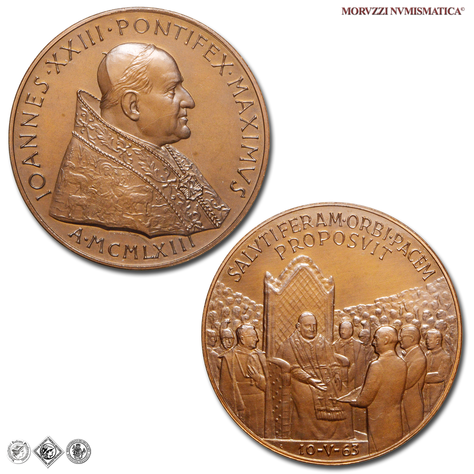 Città del Vaticano, GIOVANNI XXIII, Roncalli, 1958-1963, MEDAGLIA, Premio Balzan per la pace, Emissione: 1963, D/ IOANNES • XXIII • PONTIFEX • MAXIMVS, busto con zucchetto, mozzetta e stola a s.; sotto: A • MCMLXIII, R/ SALVTIFERAM • ORBI • PACEM / PROPOSVIT, il papa in trono, attorniato dalla folla, riceve il premio Balzan della pace; in esergo: 10-V-63, Opus Pietro Giampaoli, Rif. bibl. Modesti, 271; Metallo: AE, gr. 36,31, (MP140991), Diam.: mm. 43,96, FDC