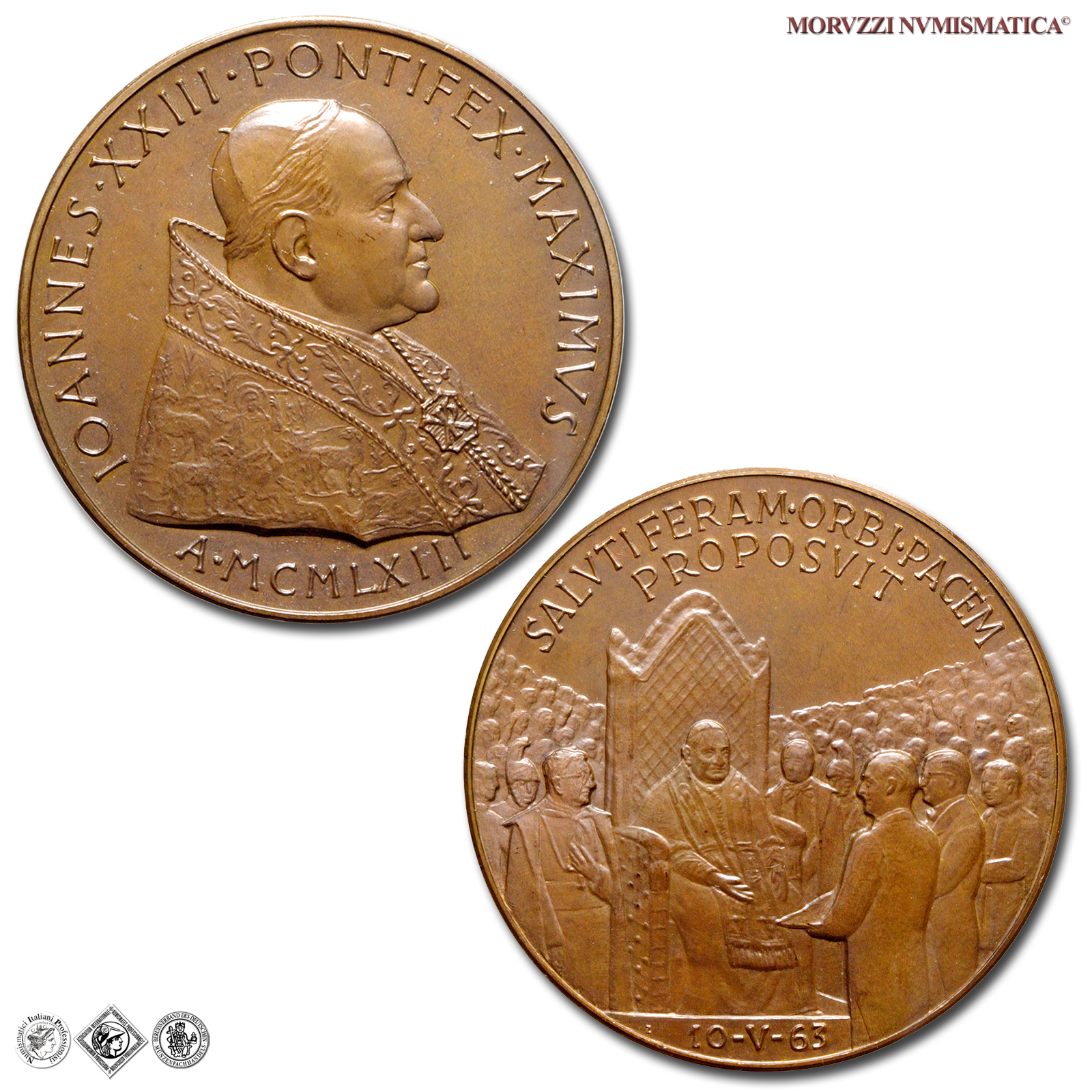 Città del Vaticano, GIOVANNI XXIII, Roncalli, 1958-1963, MEDAGLIA, Premio Balzan per la pace, Emissione: 1963, D/ IOANNES • XXIII • PONTIFEX • MAXIMVS, busto con zucchetto, mozzetta e stola a s.; sotto: A • MCMLXIII, R/ SALVTIFERAM • ORBI • PACEM / PROPOSVIT, il papa in trono, attorniato dalla folla, riceve il premio Balzan della pace; in esergo: 10-V-63, Opus Pietro Giampaoli, Rif. bibl. Modesti, 271; Metallo: AE, gr. 36,89, (MP140999), Diam.: mm. 44,00, FDC