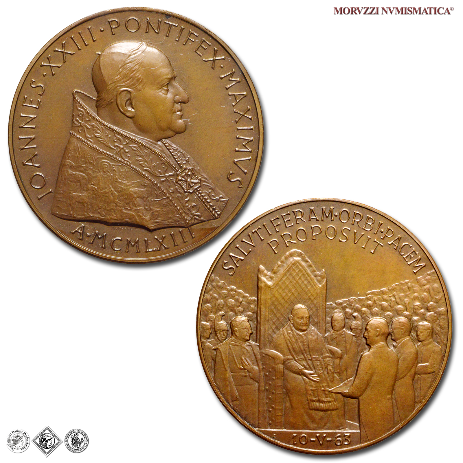Città del Vaticano, GIOVANNI XXIII, Roncalli, 1958-1963, MEDAGLIA, Premio Balzan per la pace, Emissione: 1963, D/ IOANNES • XXIII • PONTIFEX • MAXIMVS, busto con zucchetto, mozzetta e stola a s.; sotto: A • MCMLXIII, R/ SALVTIFERAM • ORBI • PACEM / PROPOSVIT, il papa in trono, attorniato dalla folla, riceve il premio Balzan della pace; in esergo: 10-V-63, Opus Pietro Giampaoli, Rif. bibl. Modesti, 271; Metallo: AE, gr. 37,09, (MP141004), Diam.: mm. 43,93, FDC