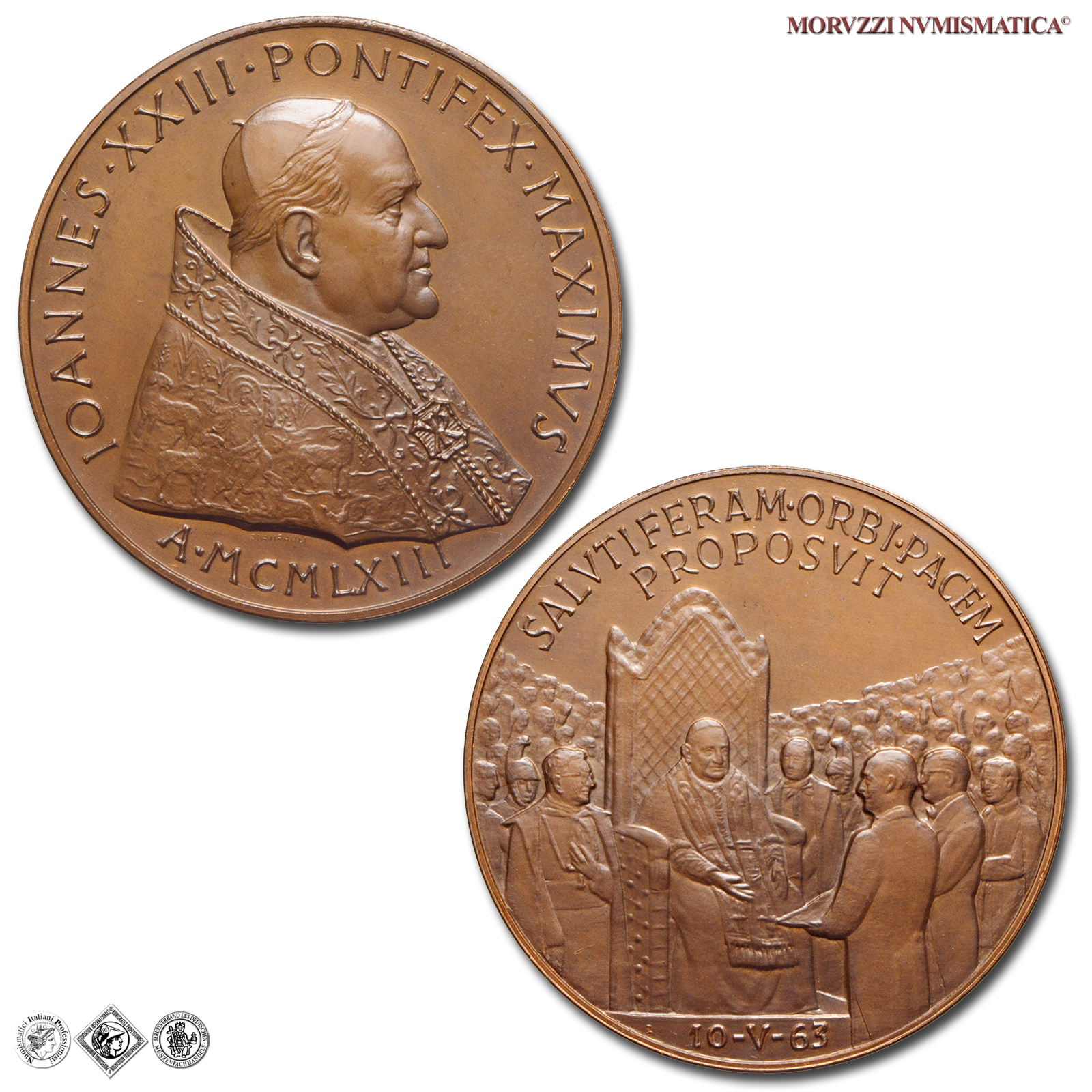 Città del Vaticano, GIOVANNI XXIII, Roncalli, 1958-1963, MEDAGLIA, Premio Balzan per la pace, Emissione: 1963, D/ IOANNES • XXIII • PONTIFEX • MAXIMVS, busto con zucchetto, mozzetta e stola a s.; sotto: A • MCMLXIII, R/ SALVTIFERAM • ORBI • PACEM / PROPOSVIT, il papa in trono, attorniato dalla folla, riceve il premio Balzan della pace; in esergo: 10-V-63, Opus Pietro Giampaoli, Rif. bibl. Modesti, 271; Metallo: AE, gr. 36,37, (MP140986), Diam.: mm. 43,99, FDC