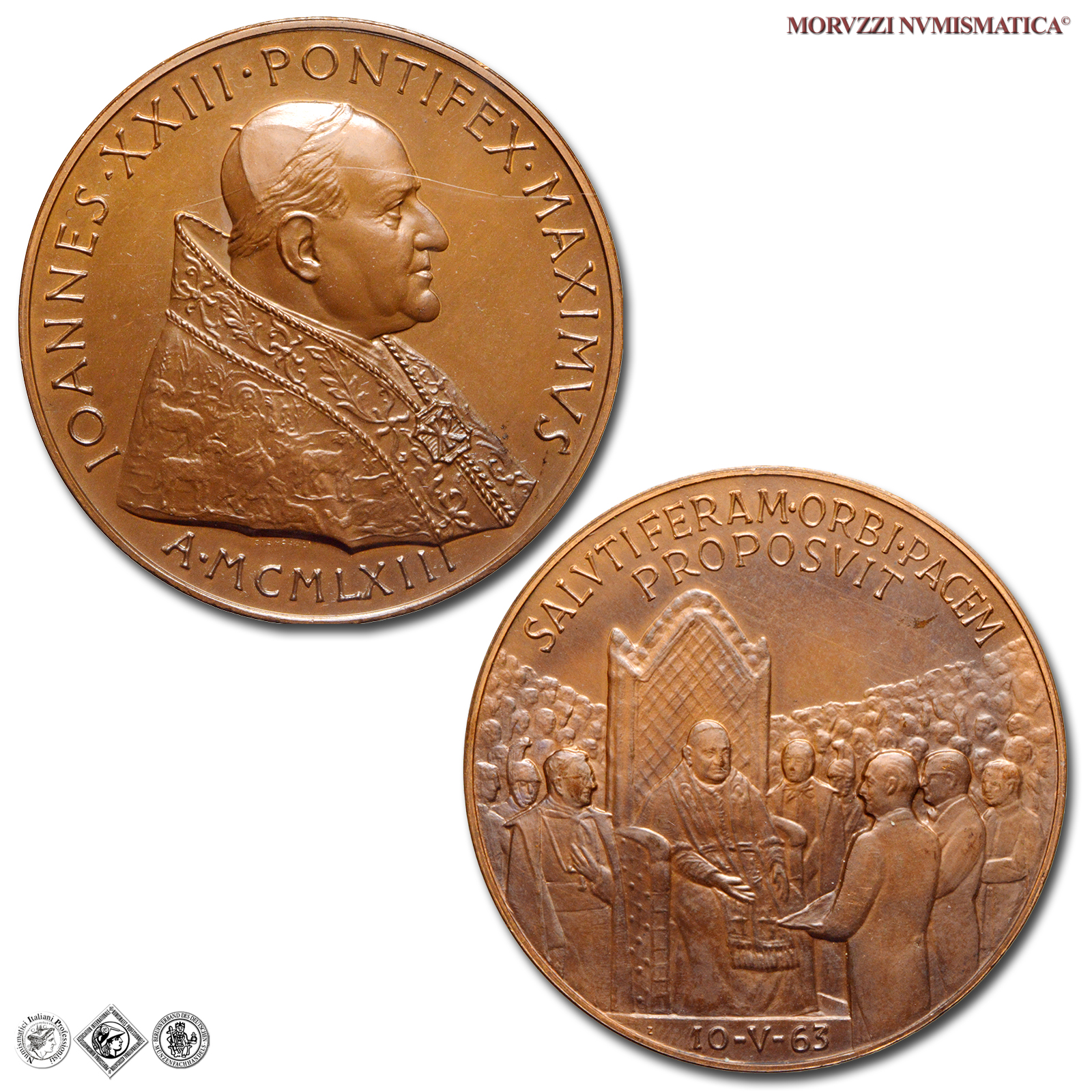 Città del Vaticano, GIOVANNI XXIII, Roncalli, 1958-1963, MEDAGLIA, Premio Balzan per la pace, Emissione: 1963, D/ IOANNES • XXIII • PONTIFEX • MAXIMVS, busto con zucchetto, mozzetta e stola a s.; sotto: A • MCMLXIII, R/ SALVTIFERAM • ORBI • PACEM / PROPOSVIT, il papa in trono, attorniato dalla folla, riceve il premio Balzan della pace; in esergo: 10-V-63, Opus Pietro Giampaoli, Rif. bibl. Modesti, 271; Metallo: AE, gr. 36,32, (MP140988), Diam.: mm. 43,99, FDC