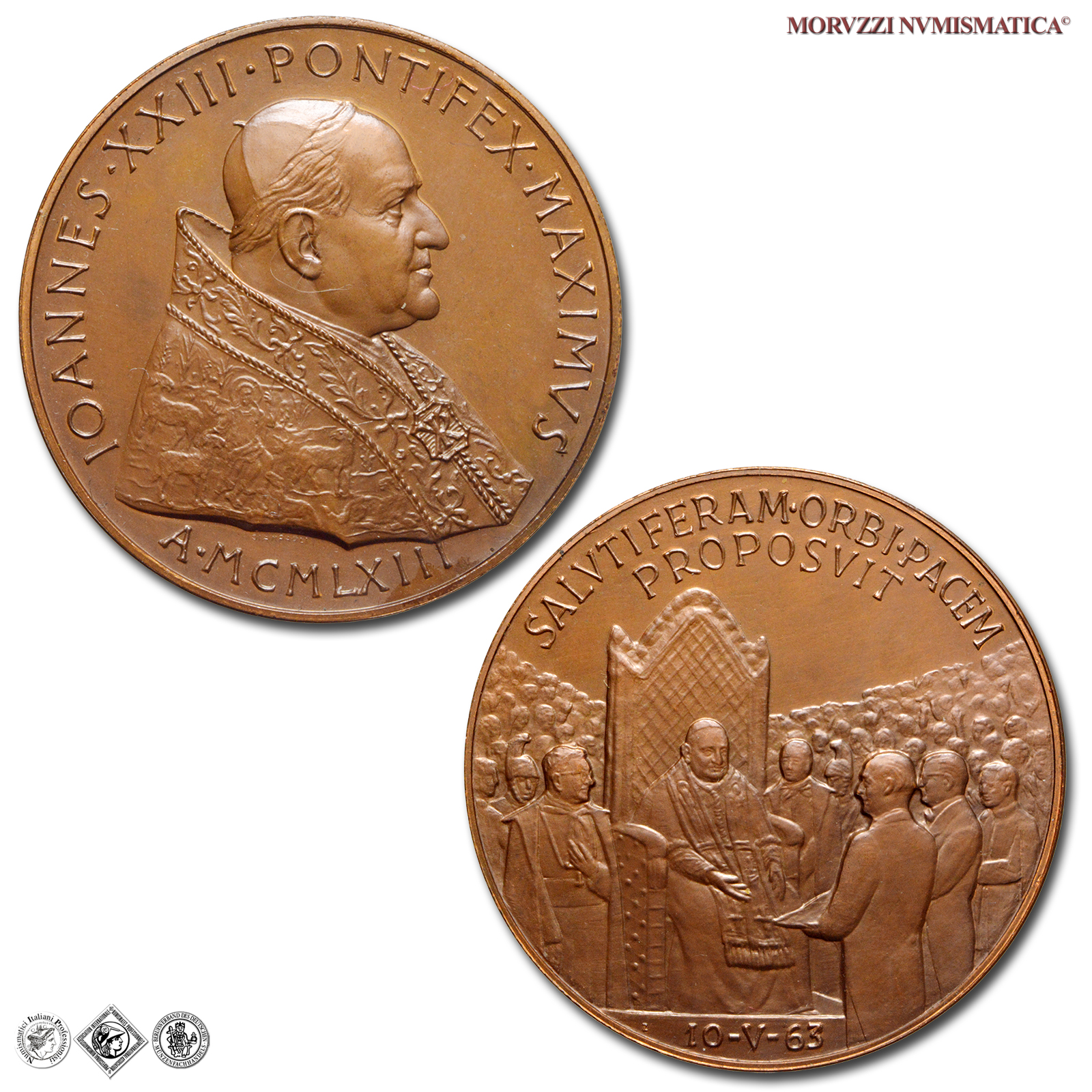Città del Vaticano, GIOVANNI XXIII, Roncalli, 1958-1963, MEDAGLIA, Premio Balzan per la pace, Emissione: 1963, D/ IOANNES • XXIII • PONTIFEX • MAXIMVS, busto con zucchetto, mozzetta e stola a s.; sotto: A • MCMLXIII, R/ SALVTIFERAM • ORBI • PACEM / PROPOSVIT, il papa in trono, attorniato dalla folla, riceve il premio Balzan della pace; in esergo: 10-V-63, Opus Pietro Giampaoli, Rif. bibl. Modesti, 271; Metallo: AE, gr. 36,40, (MP140989), Diam.: mm. 44,00, FDC
