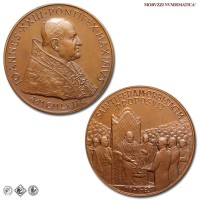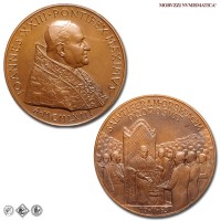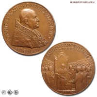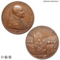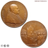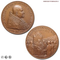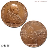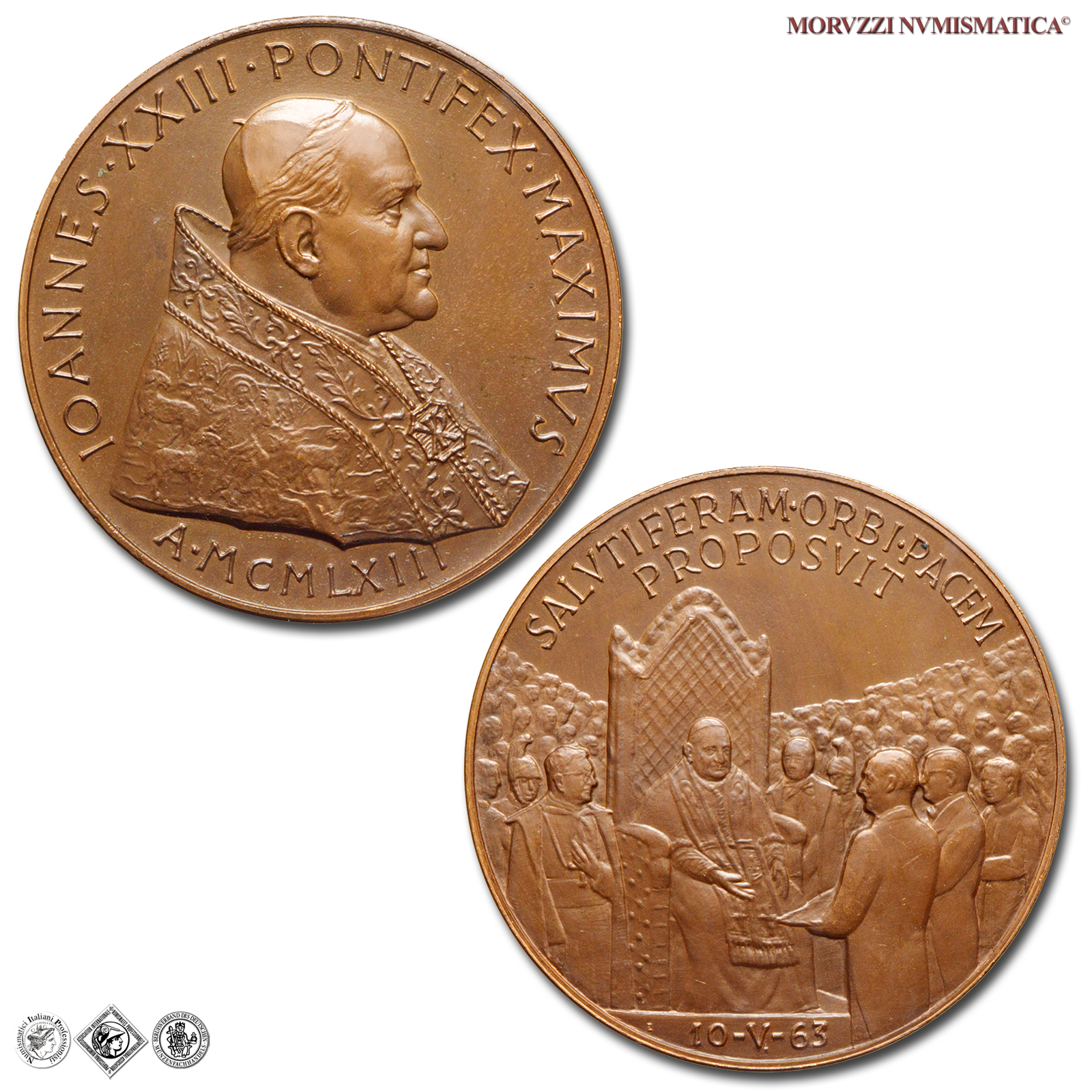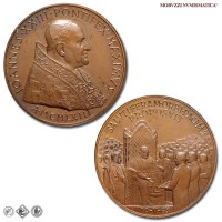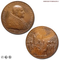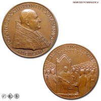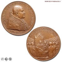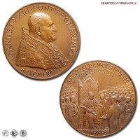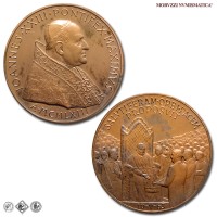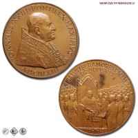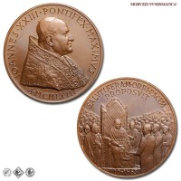 Città del Vaticano, GIOVANNI XXIII, Roncalli, 1958-1963, MEDAGLIA, Premio Balzan per la pace, Emissione: 1963, D/ IOANNES • XXIII • PONTIFEX • MAXIMVS, busto con zucchetto, mozzetta e stola a s.; sotto: A • MCMLXIII, R/ SALVTIFERAM • ORBI • PACEM / PROPOSVIT, il papa in trono, attorniato dalla folla, riceve il premio Balzan della pace; in esergo: 10-V-63, Opus Pietro Giampaoli, Rif. bibl. Modesti, 271; Metallo: AE, gr. 36,29, (MP140983), Diam.: mm. 44,02, FDC