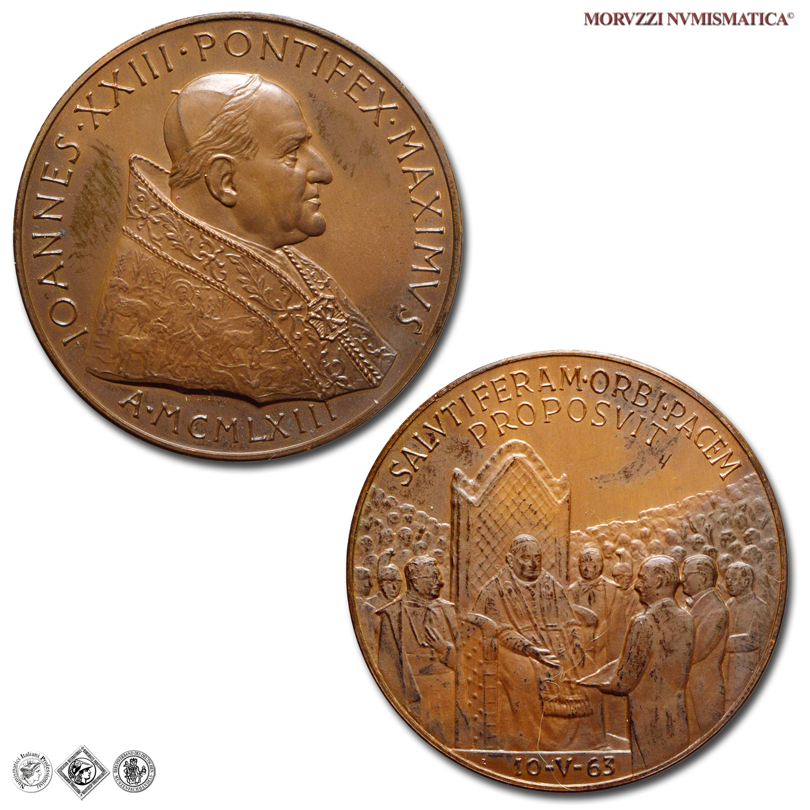 Città del Vaticano, GIOVANNI XXIII, Roncalli, 1958-1963, MEDAGLIA, Premio Balzan per la pace, Emissione: 1963, D/ IOANNES • XXIII • PONTIFEX • MAXIMVS, busto con zucchetto, mozzetta e stola a s.; sotto: A • MCMLXIII, R/ SALVTIFERAM • ORBI • PACEM / PROPOSVIT, il papa in trono, attorniato dalla folla, riceve il premio Balzan della pace; in esergo: 10-V-63, Opus Pietro Giampaoli, Rif. bibl. Modesti, 271; Metallo: AE, gr. 36,19, (MP140997), Diam.: mm. 44,02, mSPL