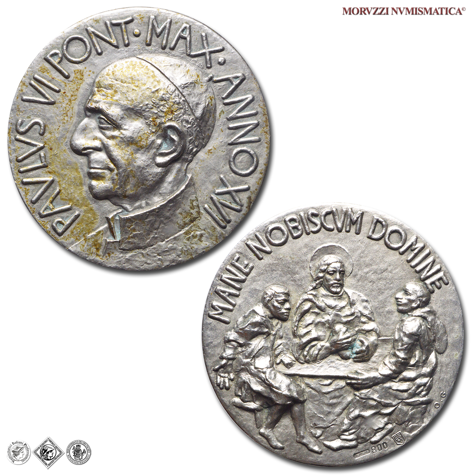 Città del Vaticano, PAOLO VI, Montini, 1963-1978, MEDAGLIA, Mane Nobiscum Domine, Emissione: A. XVI, D/ PAVLVS VI PONT • MAX • ANNO XVI, Busto del Pontefice a sinistra, R/ MANE NOBISCVM DOMINE, Cristo nimbato seduto ad un tavolo spezza il pane; in basso, a destra: O.G, Opus Oscar Gallo, Rif. bibl. Unif., p. 497; Modesti, 446; Metallo: AR, gr. 36,56, (MP158952), Diam.: mm. 44,20, FDC