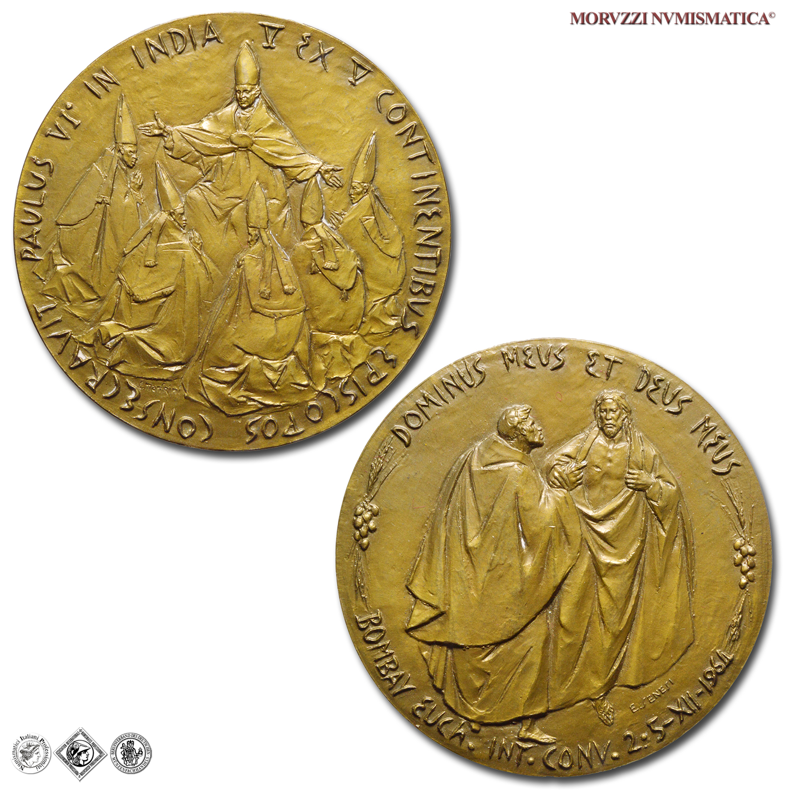 Città del Vaticano, PAOLO VI, Montini, 1963-1978, MEDAGLIA, Viaggio in India, Emissione: 1964, D/ PAULUS VI° IN INDIA V EX V CONTINENTIBUS EPISCOPOS CONSECRAVIT, Il Papa accoglie le preghiere dei nuovi vescovi; in basso a sinistra: E. MANFRINI, R/ DOMINUS MEUS ET DEUS MEUS (tra spighe e grappoli), Un martire mostra le sue ferite a Cristo; sotto: BOMBAY EUCH. INT. CONV. 2.5-XII-1964; in basso, a destra: E. SENESI, Opus Enrico Manfrini ed Emilio Senesi, Rif. bibl. Macri-Marinelli, 137; Metallo: AE, gr. 37,14, (MP153998), Diam.: mm. 44,19, FDC