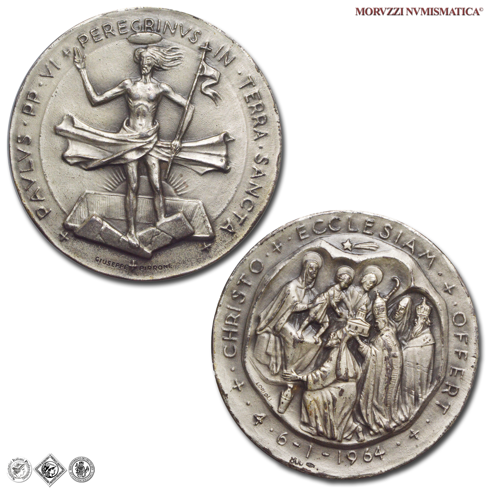 Città del Vaticano, PAOLO VI, Montini, 1963-1978, MEDAGLIA, Pellegrinaggio in Terra Santa - adorazione dei Magi, Emissione: 1964, D/ PAVLVS • PP • VI ✠ PEREGRINVS IN • TERRA • SANCTA, Cristo Gesú risorto benedicente, in piedi di fronte, nimbato, davanti al sole nascente; sotto: GIUSEPPE ✠ PIRRONE, R/ ✠ • CHRISTO • ✠ • ECCLESIAM • ✠ • OFFERT • ✠ / • 4 • 6 - 1 - 1964 •, l'adorazione dei Re Magi, Opus Giuseppe Pirrone, Rif. bibl. Macri-Marinelli, 72; Metallo: AR, gr. 41,73, (MP159940), Diam.: mm. 43,54, qFDC, (R)