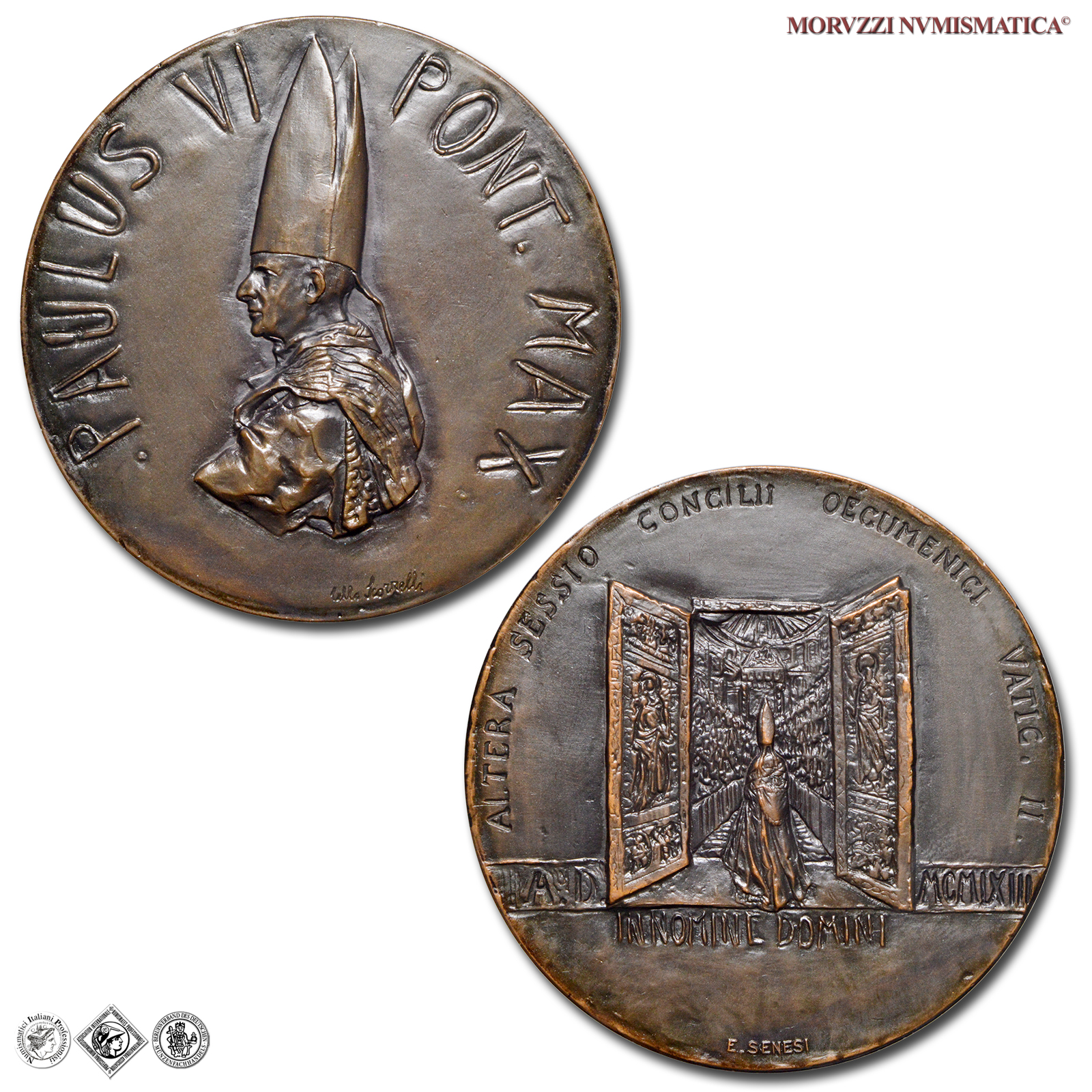 Città del Vaticano, PAOLO VI, Montini, 1963-1978, MEDAGLIA, Concilio Ecumenico II sessione, Emissione: 1963, D/ PAVLVS VI PONT. MAX., busto del Pontefice con mitra, fanone, pallio e pianeta a s.; sotto corsivo: LELLO SCORZELLI, R/ ALTERA SESSIO CONCILII OECVMENICI VATIC. II, entrata del Pontefice in piedi e di spalle, con mitra e piviale, al Concilio; ai lati entro nastro: A.D. MCMLXIII; sotto: IN NOMINE DOMINI; in basso: E. SENESI, Opus Lello Scorzelli, Rif. bibl. Macri-Marinelli, 49; Unif., pag. 498; Metallo: AE, gr. 41,19, (MP154006), Diam.: mm. 44,01, FDC