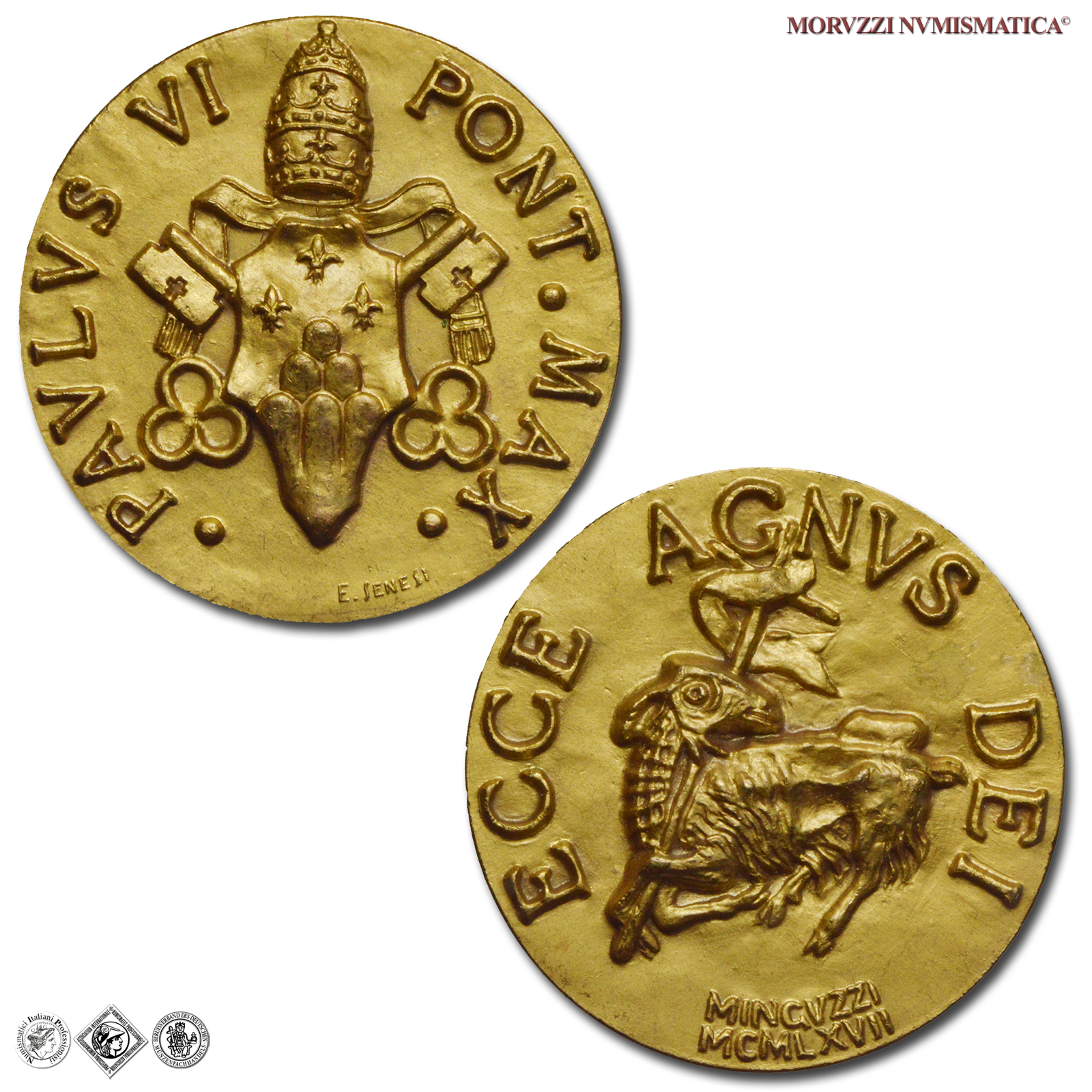 Città del Vaticano, PAOLO VI, Montini, 1963-1978, MEDAGLIA, Natale 1967 - Ecce Agnvs Dei, Emissione: 1967, D/ • PAVLVS VI _ PONT • MAX •, Stemma Papale su chiavi decussate coronato da triregno, R/ ECCE AGNVS DEI, l'Agnello di Dio a s.; sotto: MINGVZZI / MCMLXVII, Opus Luciano Minguzzi, Rif. bibl. Macri-Marinelli, 235; Calò, 73; Metallo: AE dorato, gr. 17,75, (MP131344), Diam.: mm. 33,86, FDC, (NC)